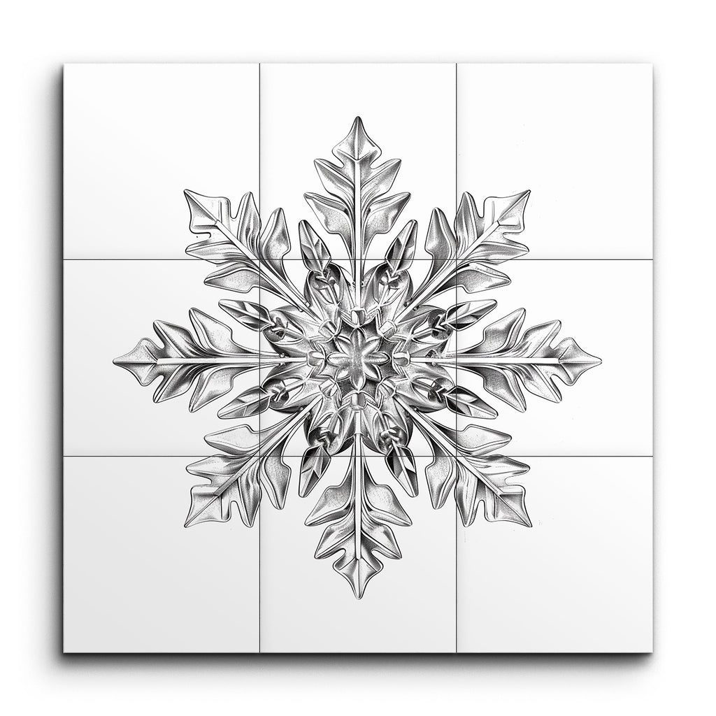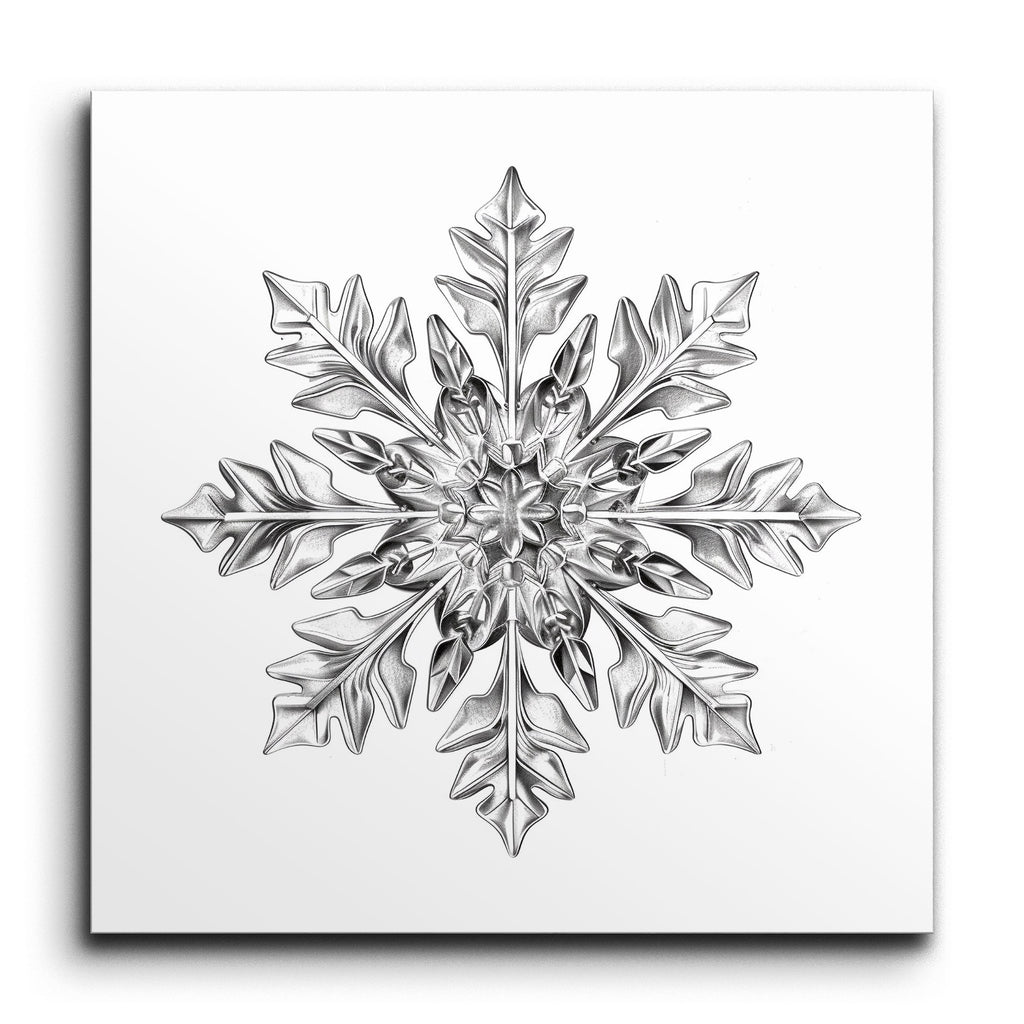 Transform your space with this captivating tile mural, featuring an intricately detailed snowflake design. At its center is a hexagonal shape, from which six primary branches extend, each adorned with leaf-like structures that add depth and texture. The leaves' metallic, reflective quality creates a stunning three-dimensional effect. This monochromatic masterpiece, rendered in shades of grey and silver, combines realism and abstraction to deliver a sophisticated and elegant visual experience.