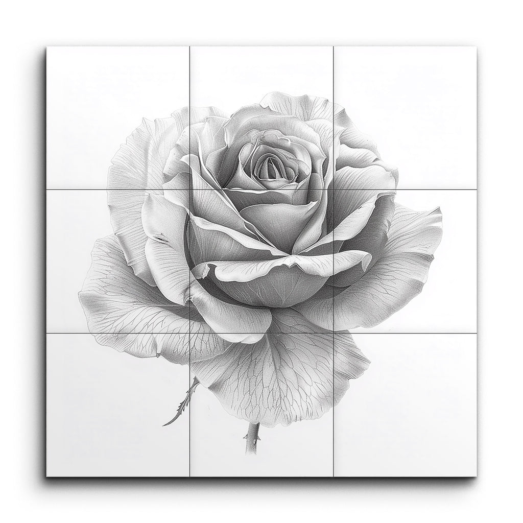 Transform your space with this stunning tile mural featuring a hyper-realistic pencil drawing of a rose. The grayscale artwork captures the delicate texture and intricate shading of each petal, from the tightly packed center to the gracefully unfurling outer petals. The lifelike veins and meticulously detailed thorns add to its natural beauty, creating a captivating focal point that exudes elegance and sophistication. Perfect for adding a touch of artistry to any room.