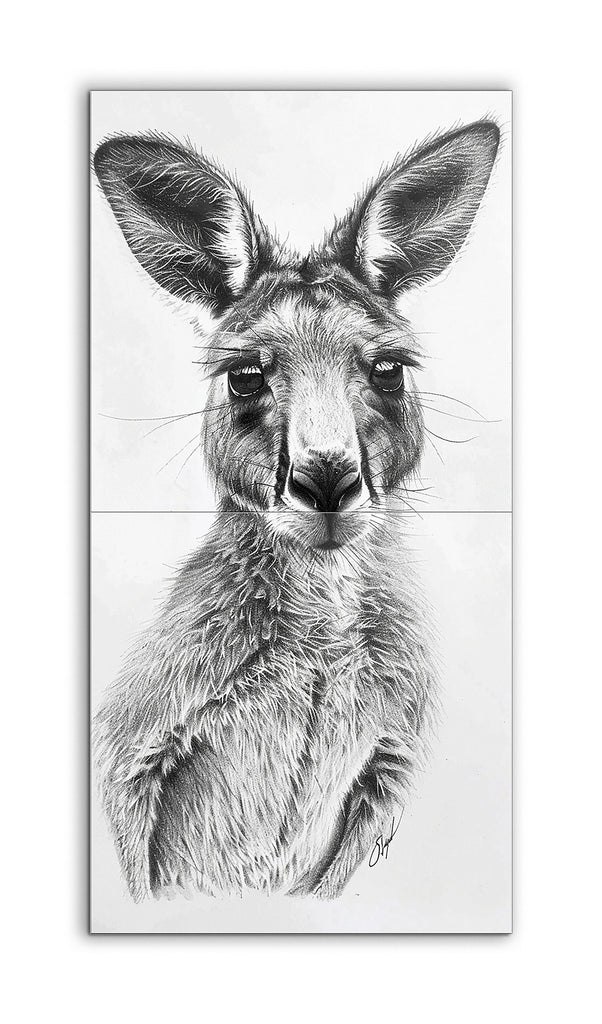 This tile mural features a hyper-realistic black-and-white drawing of a kangaroo, captured from the chest up. The artwork meticulously renders the fur texture with a variety of shades and fine lines, presenting a lifelike appearance. The kangaroo's expressive eyes and large, upright ears are intricately detailed, while the nose and mouth area exhibit subtle shading and texturing. This piece showcases a masterful focus on detail and precision, creating an astonishingly realistic representation of the animal.