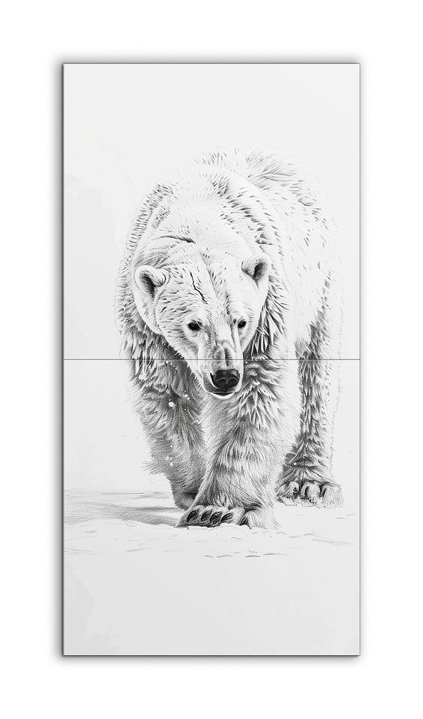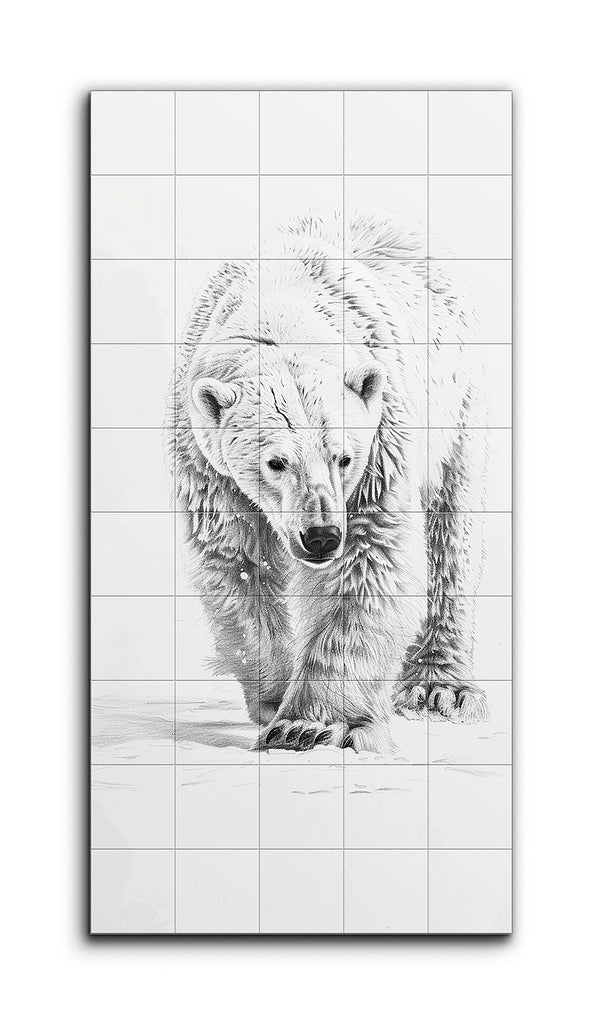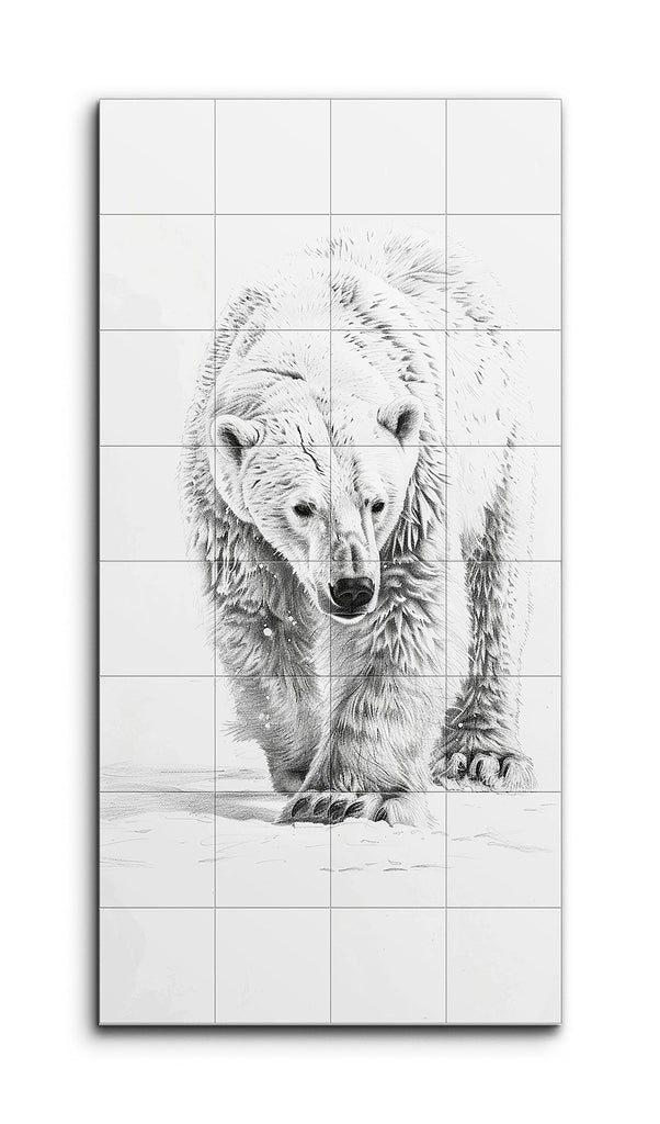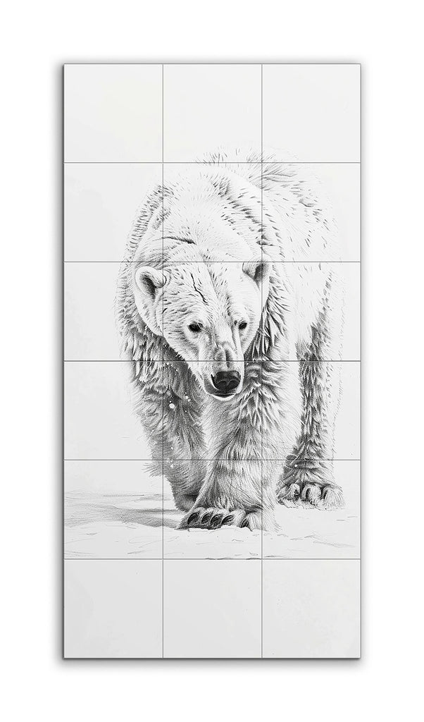 This tile mural showcases a hyper-realistic illustration of a polar bear, meticulously detailed and lifelike. The bear strides forward with focused eyes and a slightly lowered head, its dense fur rendered with fine lines and shading to emphasize texture and depth. The monochromatic palette of black and white enhances the contrast, while the minimalistic background keeps the attention on the bear's powerful presence. The artist's skillful use of light and shadow creates a three-dimensional effect, making the bear appear almost tangible.