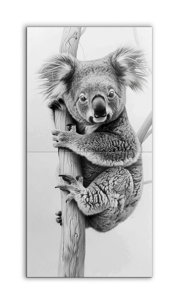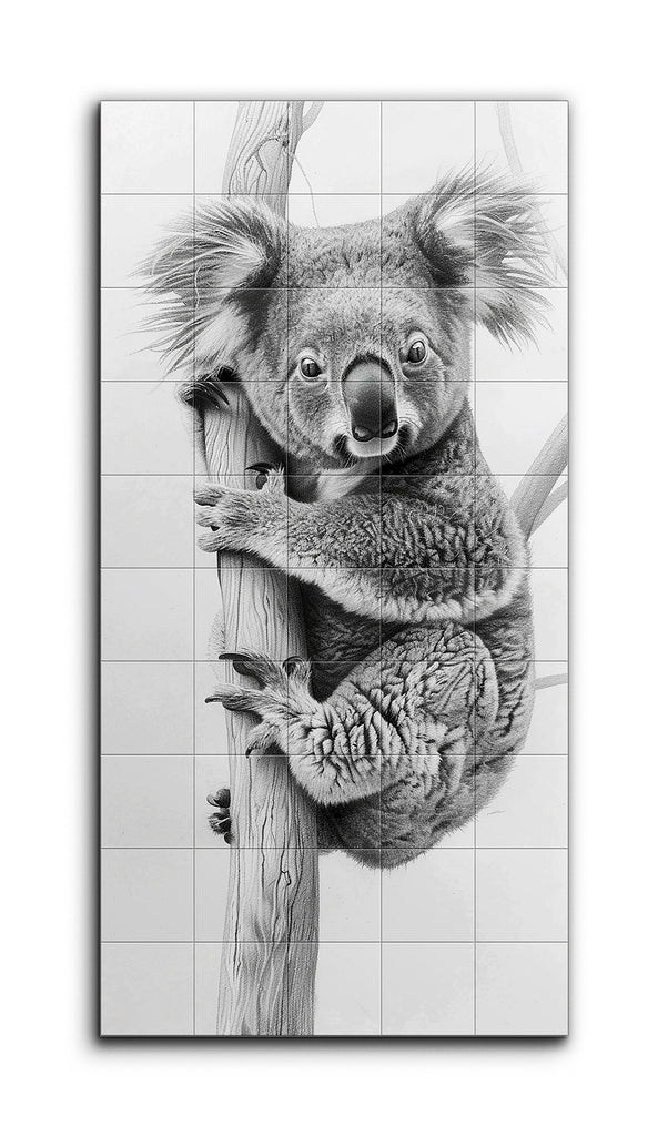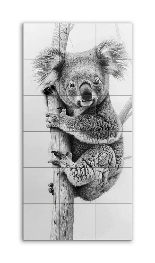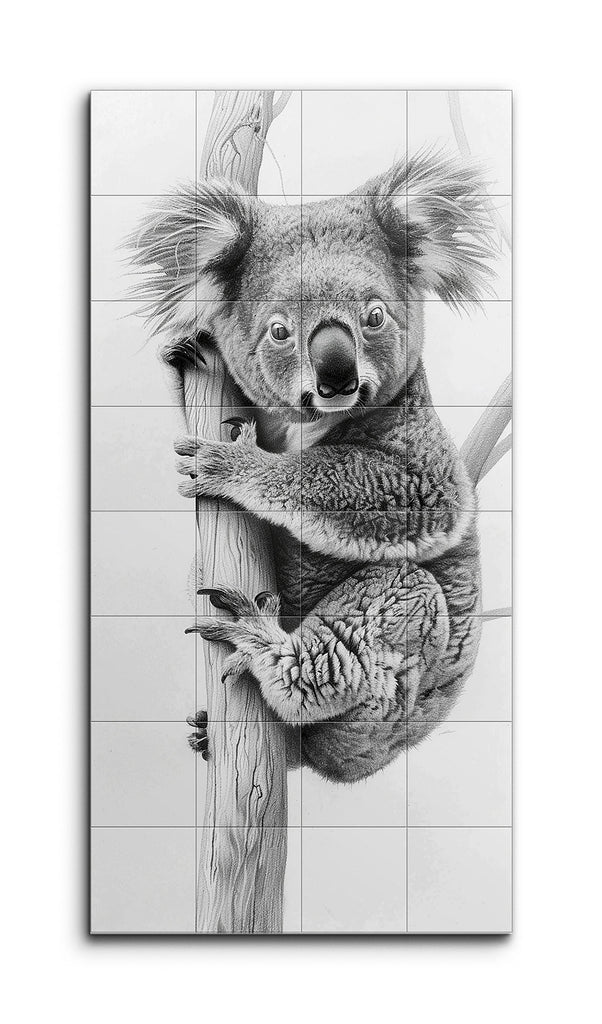This tile mural features a hyperrealistic black and white drawing of a koala clinging to a tree branch. The koala's fur is depicted with meticulous detail, showcasing soft, fluffy strands and capturing its gentle, calm expression with large, round eyes and a distinctive nose. The tree branch is rendered with visible wood grain and texture, adding to the lifelike quality. Expert shading and light techniques create a three-dimensional effect, emphasizing the intricate textures and fine details of both the koala and its natural habitat.
