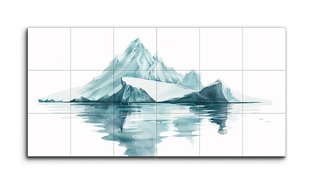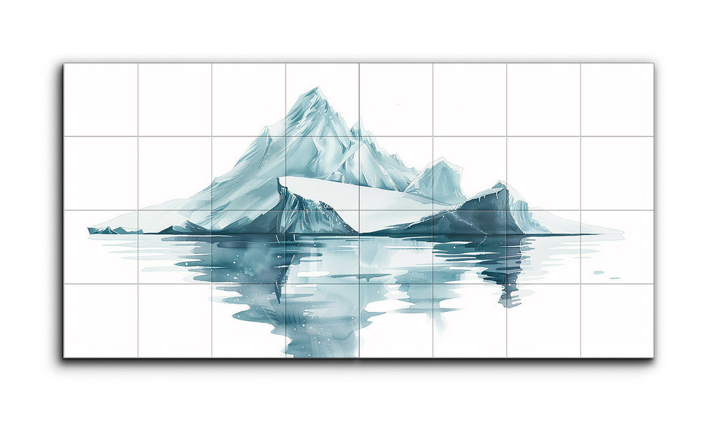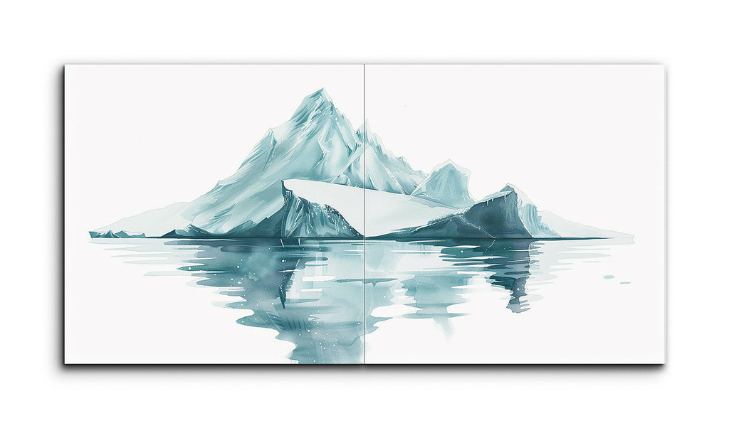 This diptych tile mural presents a serene mountain landscape, capturing the essence of a cold, icy region with snow-capped peaks and icebergs. The semi-abstract, minimalist style employs a limited palette of blues and whites, evoking cool tranquility. Fluid brushwork and soft transitions suggest a watercolor medium. The mountains and their mirror-like reflections create a near-perfect vertical symmetry, enhancing the calm, surreal atmosphere. The simplicity and focus on light and shadow lend a contemporary, minimalist feel.