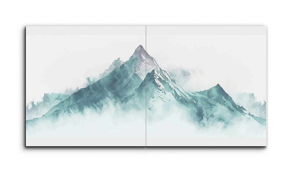 This diptych tile mural captures a majestic mountainous landscape with a blend of realism and abstraction. Shades of teal, blue, and white dominate the scene, evoking icy tranquility. Loose, expressive brushwork suggests the texture of rocky surfaces and misty atmospheres. Soft, diffuse clouds envelop the mountains, adding mystery and ethereality. The split between the two panels introduces a conceptual gap, offering a serene, contemplative visual narrative that balances detail with abstraction.