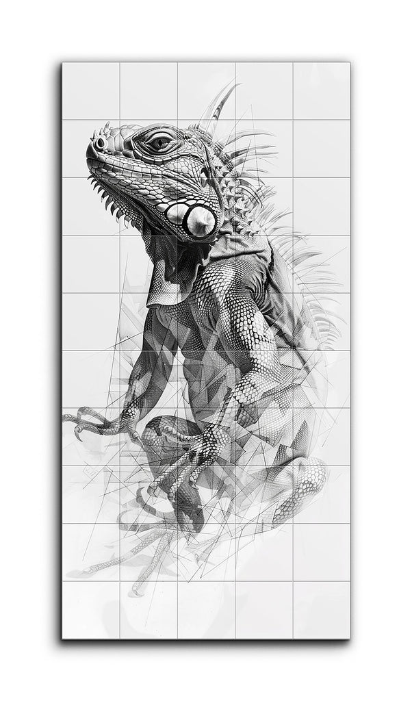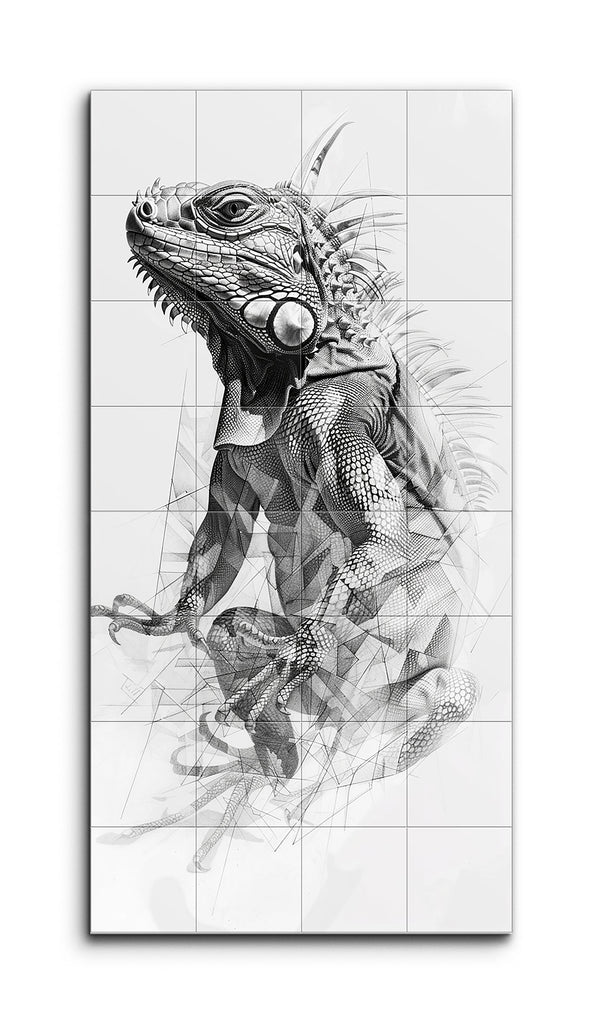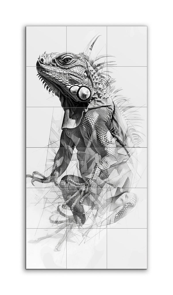 This tile mural features a detailed black and white illustration of an iguana, rendered with intricate attention to the texture of its scales and the contours of its body. Fine lines and shading create depth and dimension, giving it a lifelike appearance. The dynamic posture of the iguana, with its head raised and body slightly twisted, adds a sense of motion. Interwoven abstract geometric shapes and lines introduce a modern, digital feel, creating a striking blend of realism and contemporary abstraction.