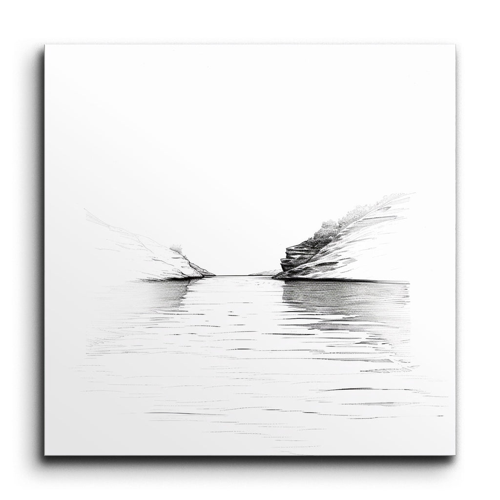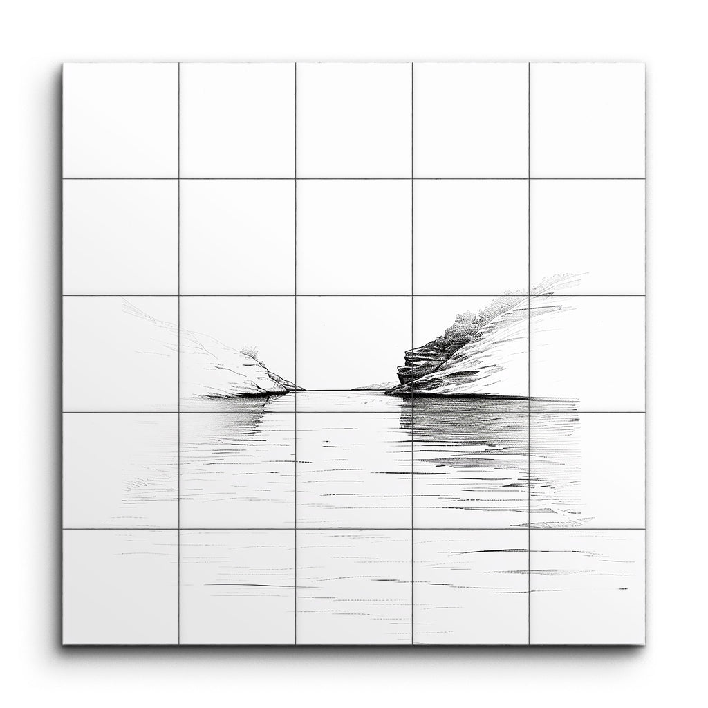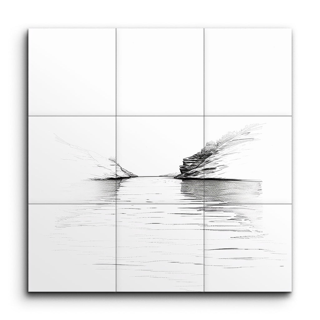 Transform your space with this captivating tile mural, featuring a minimalist depiction of a serene landscape. The monochromatic palette and fine line work bring to life a tranquil body of water, flanked by rugged cliffs on one side and a distant landmass on the other. Gentle ripples on the water's surface evoke a sense of calm, while the balanced composition and use of negative space invite contemplation and a peaceful ambiance. This artwork is a perfect blend of simplicity and depth, creating an infinite horizon that draws the viewer in.