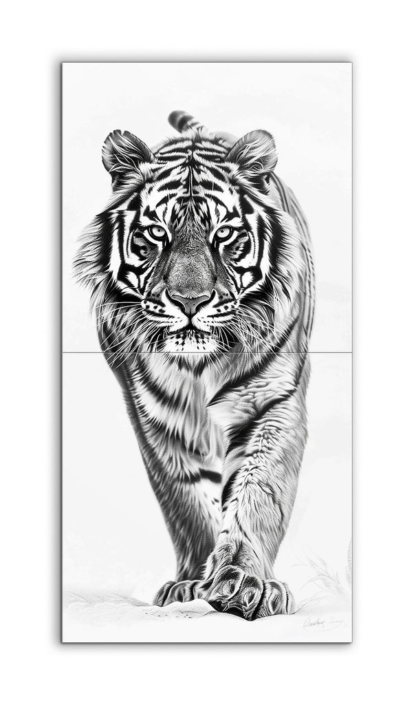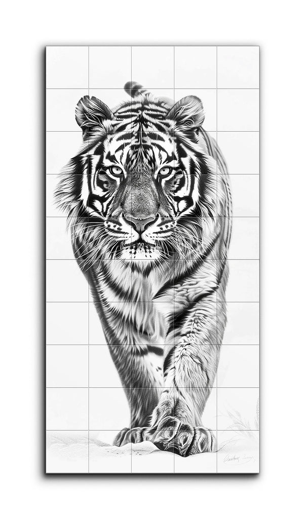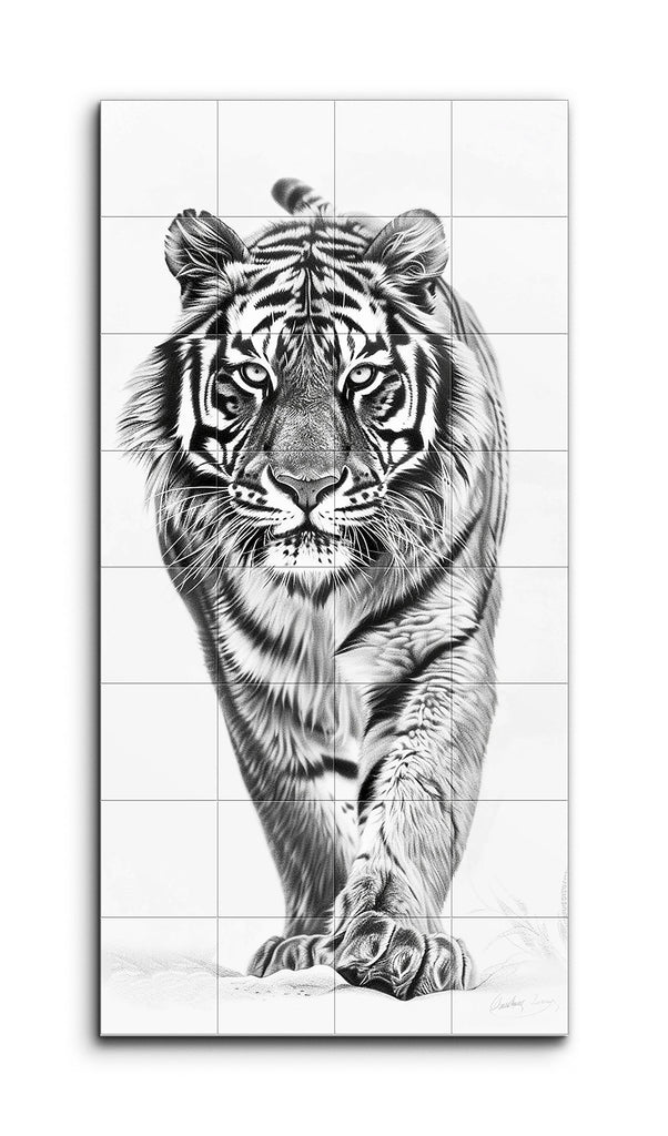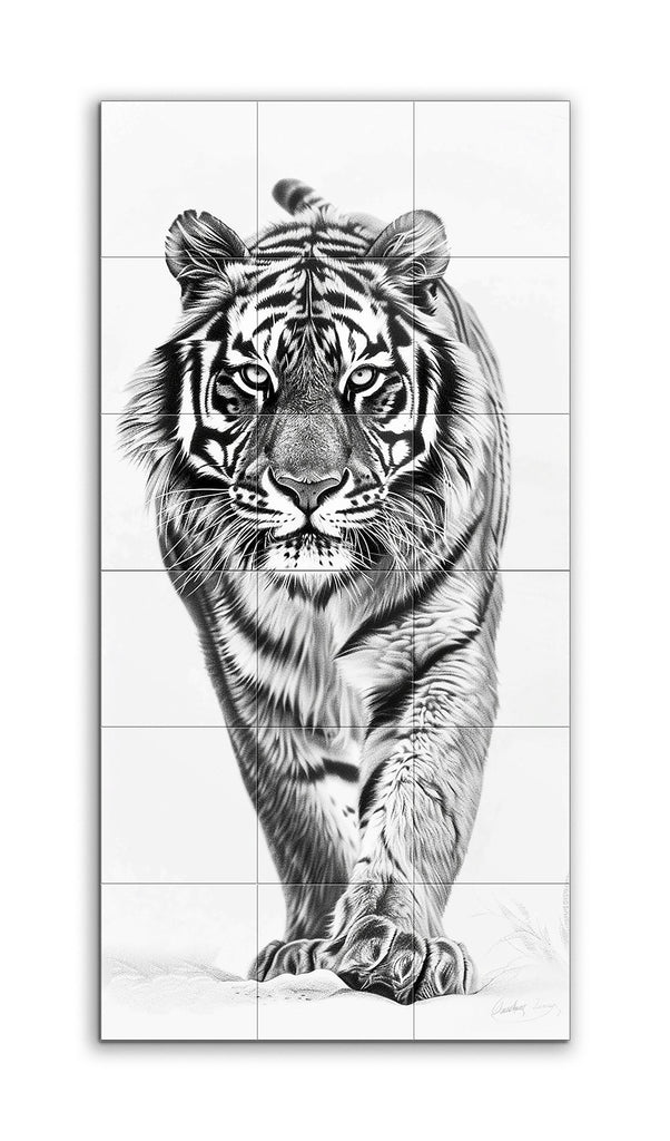 This tile mural features a highly detailed and lifelike portrayal of a tiger advancing towards the viewer, eyes intensely focused. The meticulous rendering of its fur with fine lines and shading captures the texture and distinctive stripes of the tiger's coat. The black and white color scheme adds a dramatic and timeless quality, emphasizing the contrast between dark stripes and lighter fur. Centered in the composition, the tiger's muscular build and naturalistic pose convey a commanding presence, with particular attention to the detailed paws and sharp claws.