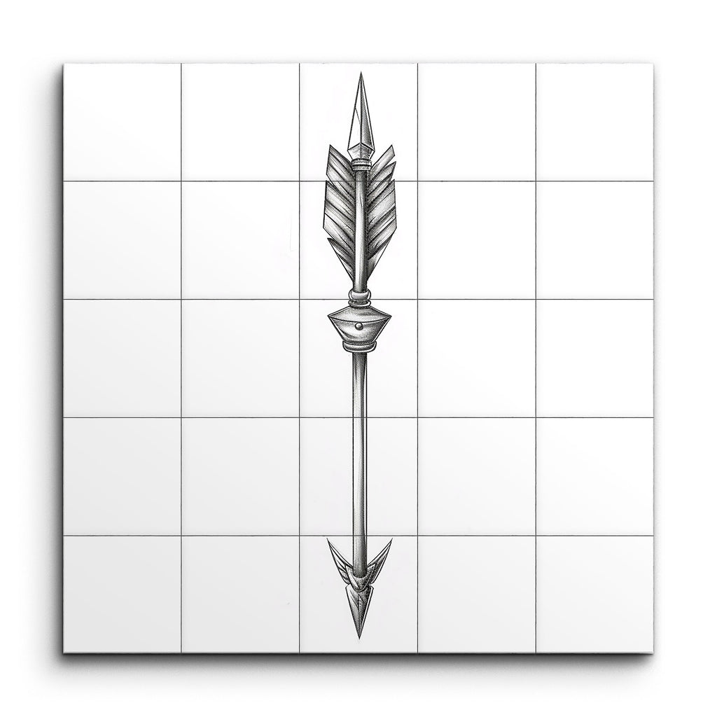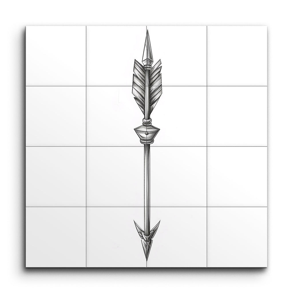 This stunning tile mural showcases a meticulously crafted, stylized arrow, blending traditional craftsmanship with a modern aesthetic. The arrowhead, adorned with intricate designs and angular facets, highlights a three-dimensional allure. The sleek, metallic shaft features a sophisticated, mechanical-like component, while the elaborate fletching boasts layers of detailed feathers, creating depth and texture. Clean lines and geometric shapes, enhanced by expert shading, bring this visually striking piece to life.