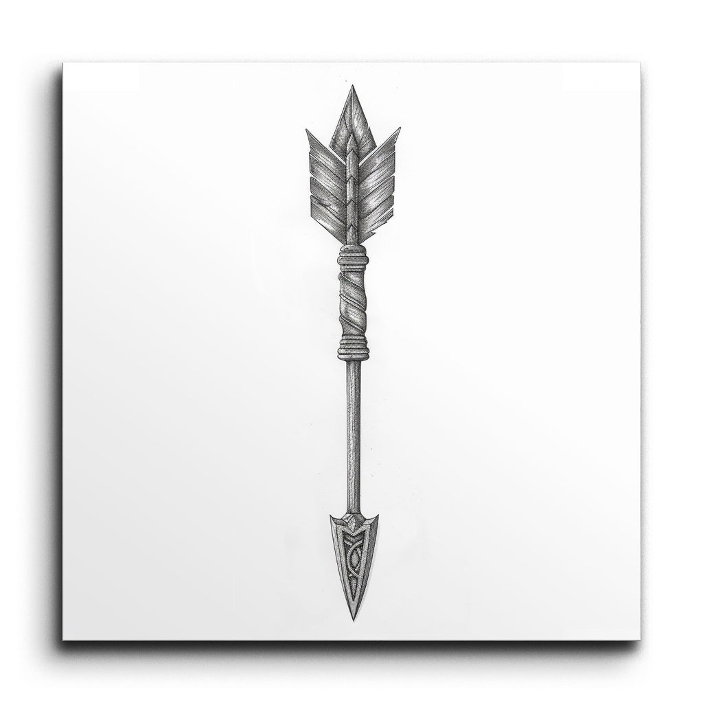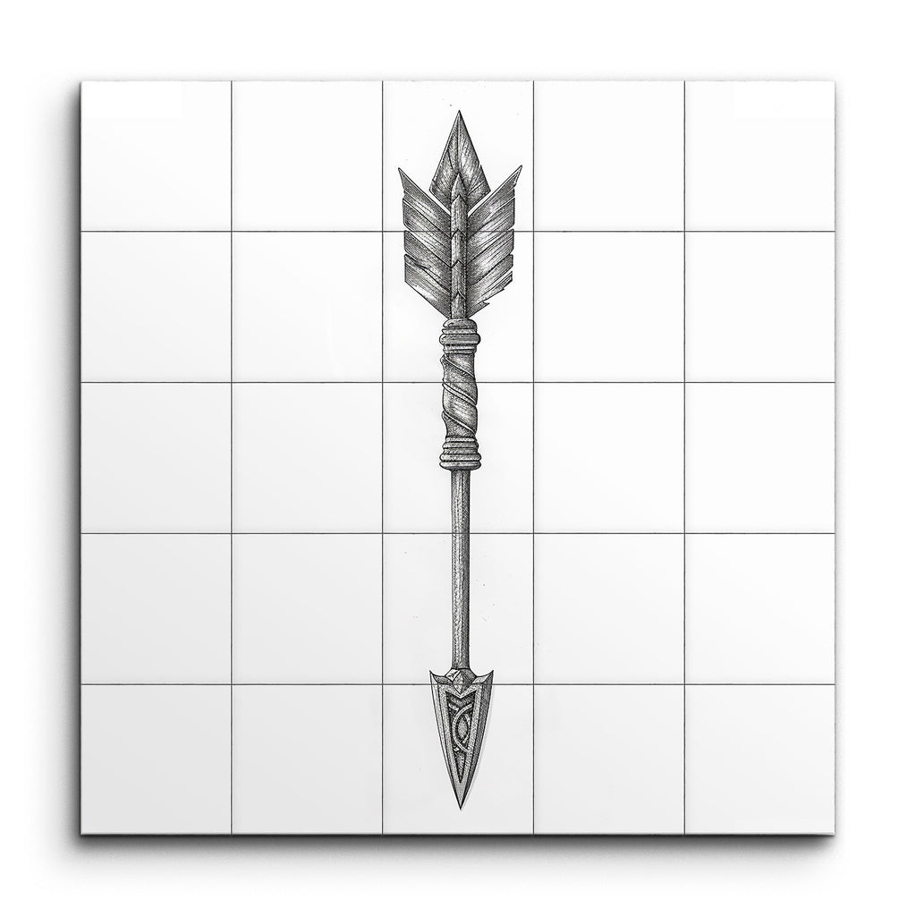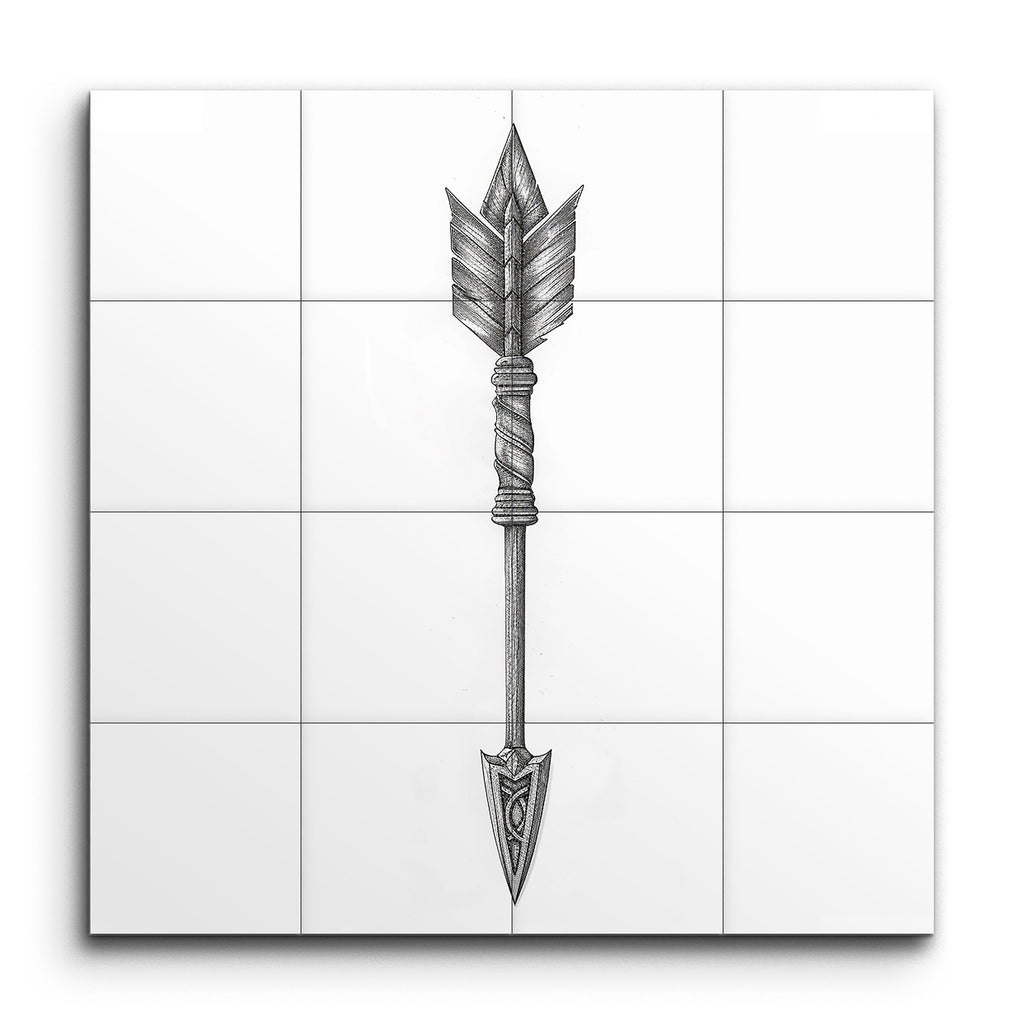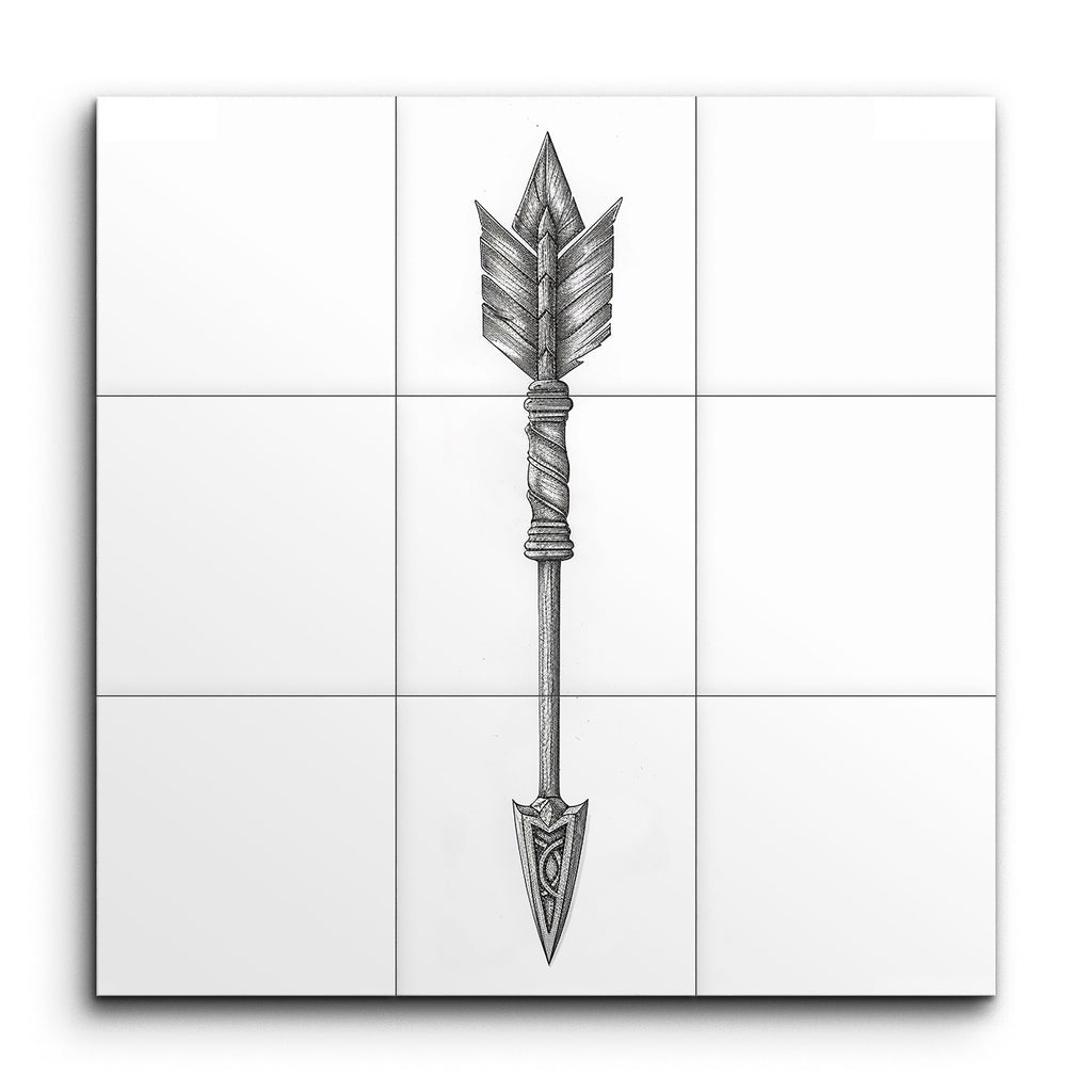 Transform your space with our captivating tile mural, featuring a meticulously detailed illustration of an arrow. The arrowhead boasts intricate patterns blending geometric and organic shapes, creating a visually stunning focal point. The straight, textured shaft and tightly wrapped bands add a sense of authenticity and craftsmanship. Symmetrical fletching with finely detailed feathers enhances the balance and aesthetic appeal. This blend of realism and decorative illustration brings depth and dynamic beauty to any setting.