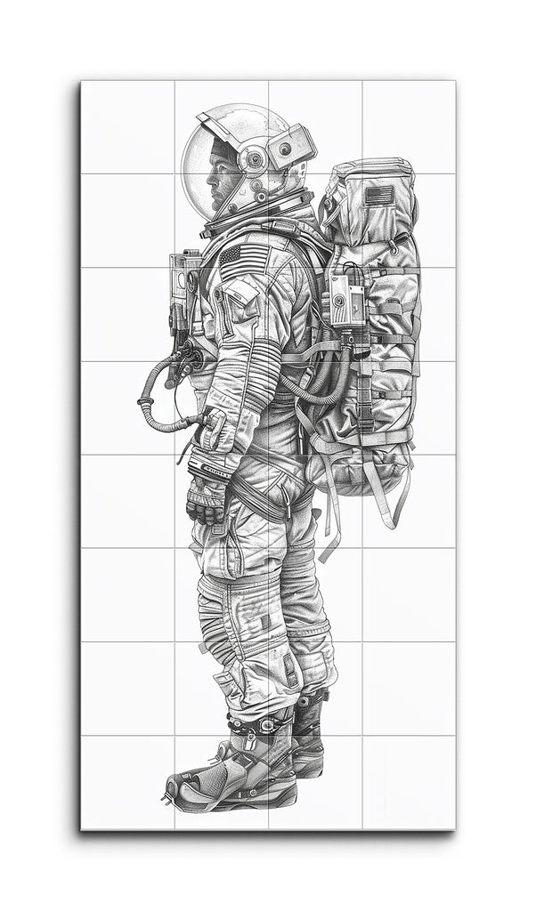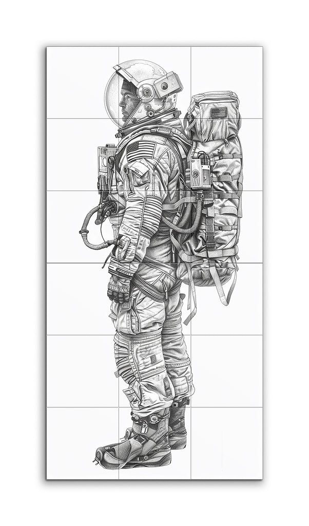This tile mural features a highly detailed black and white illustration of an astronaut in a full spacesuit, shown in a side profile view. The artwork captures the intricate design of the suit, highlighting numerous folds, seams, and technical components with meticulous line work and shading. The clear visor reveals the astronaut's face, while the complex life support system, robust boots, and flexible gloves are rendered with precision. The monochromatic palette and realistic style emphasize depth and texture, appealing to space enthusiasts and engineers alike.