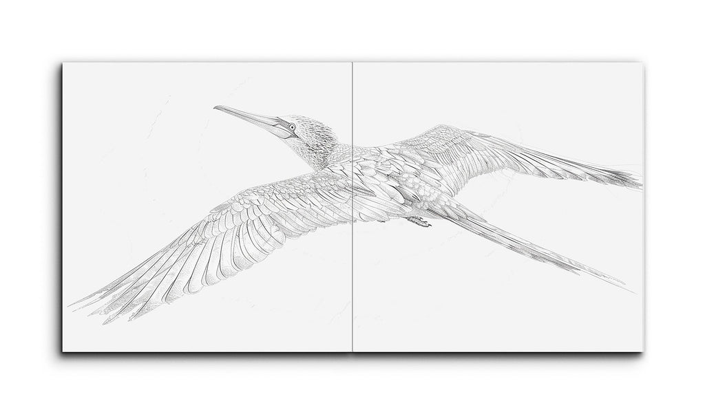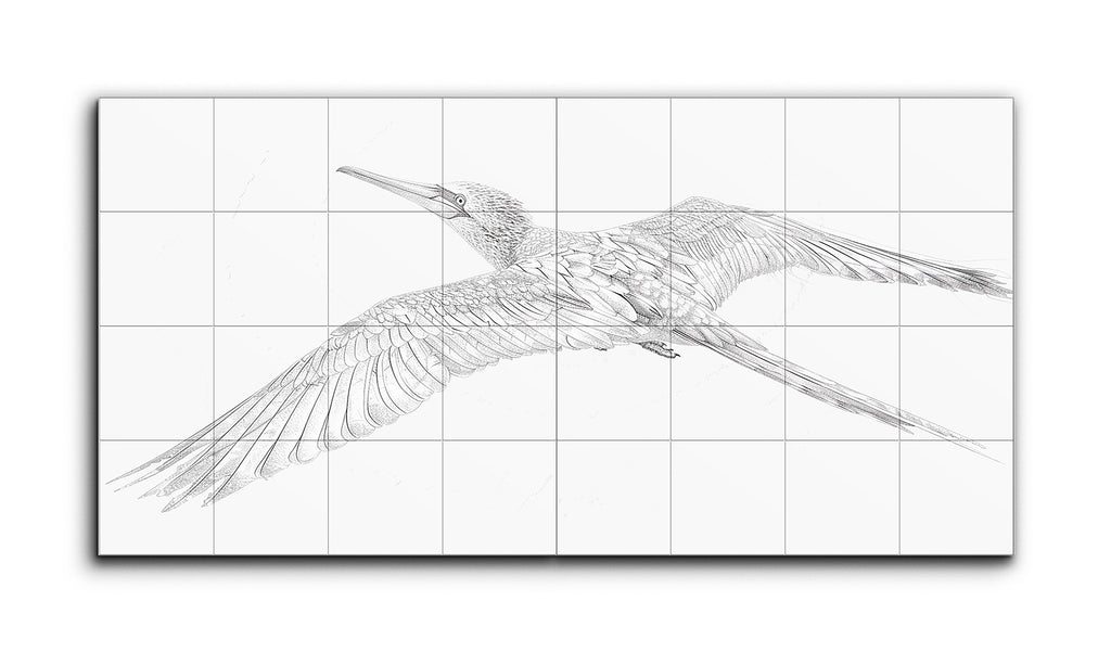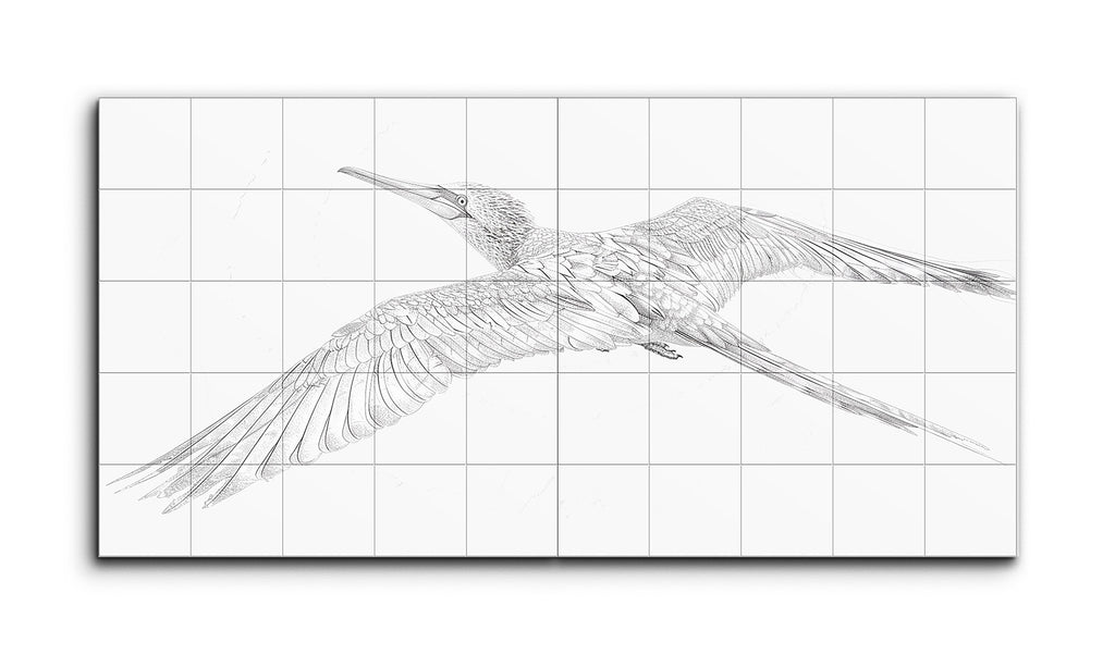 This tile mural presents a highly realistic line drawing of a bird in flight, with wings fully extended, showcasing the intricate structure and layering of its feathers. Fine, precise lines capture the texture and form of the bird's plumage, with varying weights suggesting depth and dimension. The bird's head, slightly turned to the side with a keen eye and long, pointed beak, conveys motion and alertness. The absence of color emphasizes the anatomical accuracy, allowing appreciation of the bird's complex form.