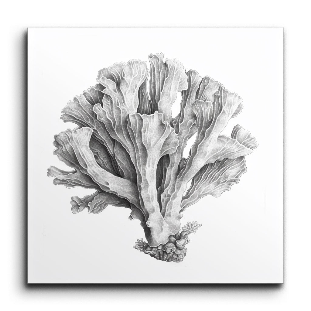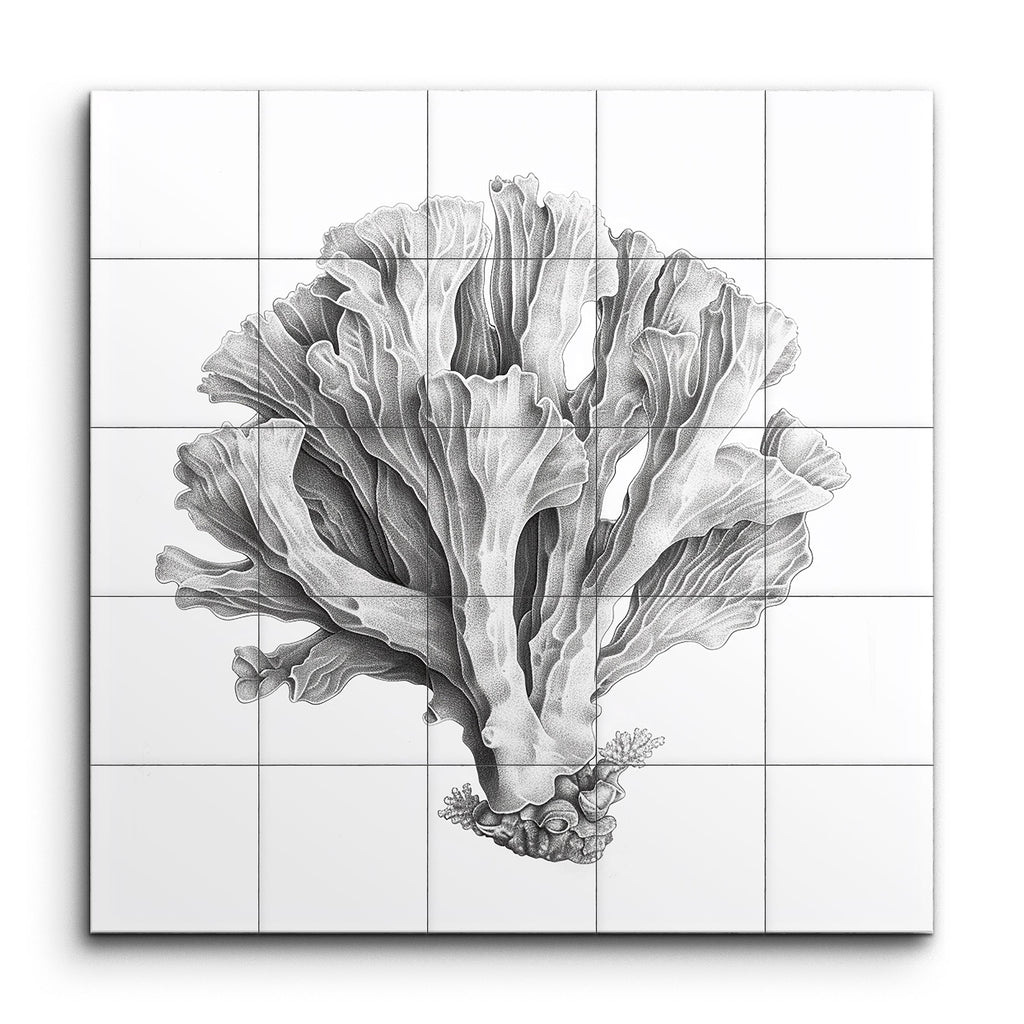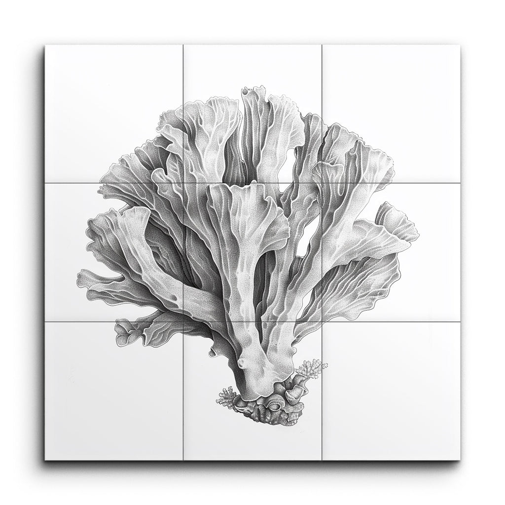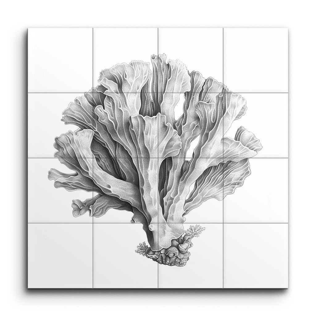 Transform your space with this captivating tile mural, showcasing a highly detailed and realistic black-and-white illustration of coral. Each intricate branch and texture is meticulously rendered, capturing the delicate complexity of this marine marvel. The finely drawn lines and precise shading bring a lifelike depth, reminiscent of scientific illustrations. This piece celebrates the natural beauty and sophistication of coral, making it a stunning focal point for any room.