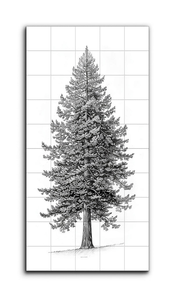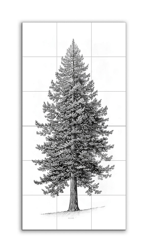 This tile mural showcases a detailed, black-and-white illustration of a tall coniferous tree, likely a pine or fir. The artwork captures the intricate patterns of its dense foliage and overlapping branches with meticulous attention. The sturdy, straight trunk features subtle shading to highlight its roundness and texture. Fine lines and shading convey the tree's natural form, while the black ink on a white background enhances the contrast and clarity of the intricate details, including the textured ground at the tree's base.