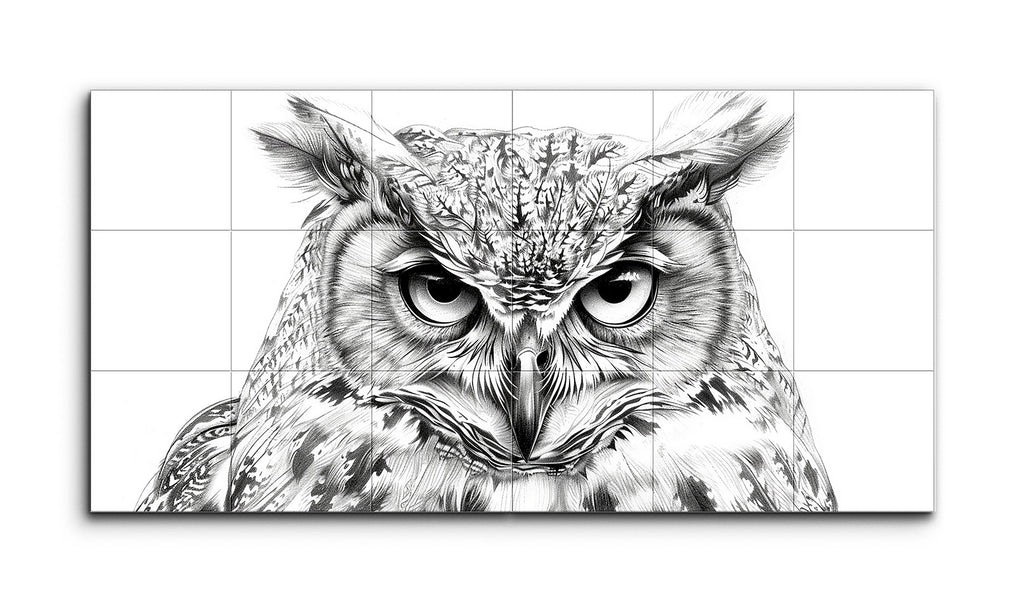 This tile mural features a meticulously detailed black and white illustration of an owl's face. The intricate line work and shading create a sense of depth and texture in the feathers, with the owl's piercing eyes drawing immediate attention. Varied patterns in the plumage, achieved through dense and sparse line clusters, highlight the natural play of light and dark. The photorealistic style captures the owl's likeness with precision, emphasizing form and texture, and conveying a sense of intensity and wisdom.
