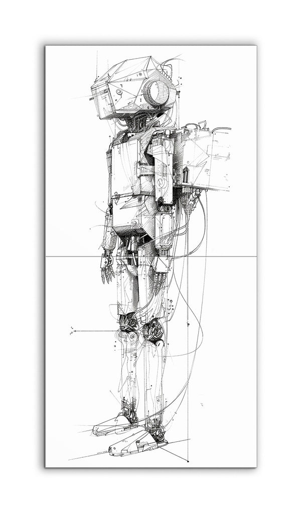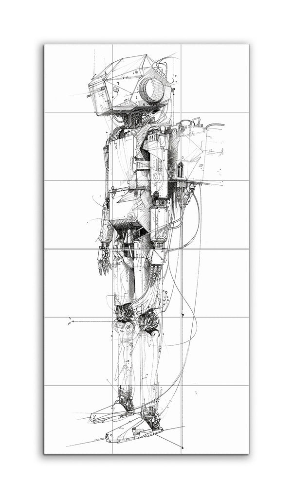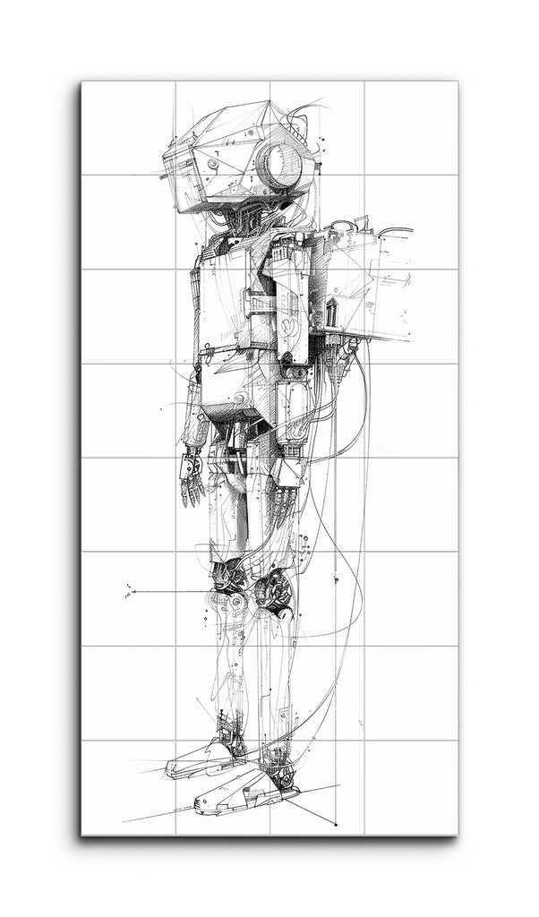 This tile mural showcases a meticulously detailed sketch of a humanoid robot, standing upright and facing left. The robot's design is a fusion of mechanical components and intricate details. Its box-like head features a circular sensor, while the rectangular torso houses internal mechanisms with extending cables and wires. Articulated arms end in skeletal, robotic hands, and the segmented legs suggest a highly engineered structure. Rendered in black ink on white, the precise lines highlight the technical intricacies, echoing an engineering blueprint.