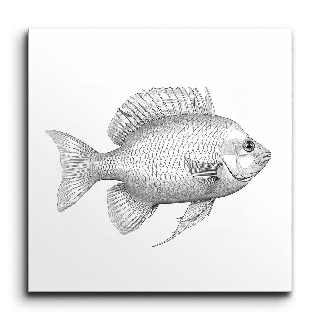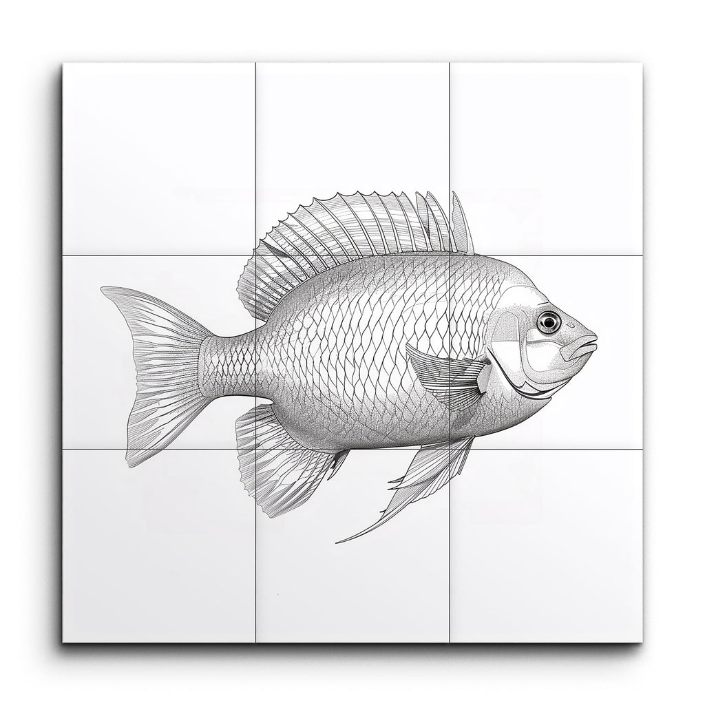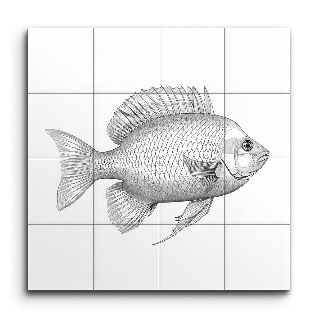 Immerse yourself in the intricate beauty of marine life with this stunning tile mural. This black and white illustration captures a fish in exquisite detail, from its meticulously rendered scales to its prominent, intricately drawn dorsal fin. The side profile view showcases the fish's entire form, with fine lines and shading that bring depth and texture to life. The scientific illustration style emphasizes precision, making this artwork a captivating focal point for any space.