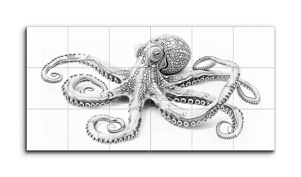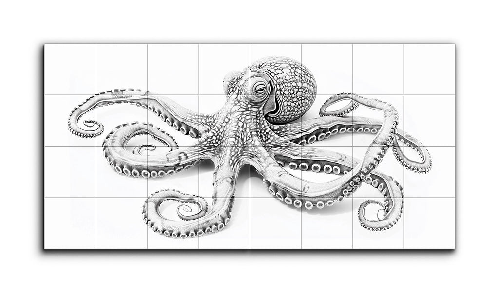 This tile mural showcases a highly detailed octopus spread across two pages of a book or foldable canvas. The monochromatic artwork uses shades of gray to create depth and texture. The octopus is meticulously rendered, with intricate details of its skin, suction cups, and muscular form. Light and shadow give it a three-dimensional appearance, while the curling tentacles add dynamic movement. The striking eye and tactile quality of the suction cups highlight the artist's craftsmanship in depicting marine life.