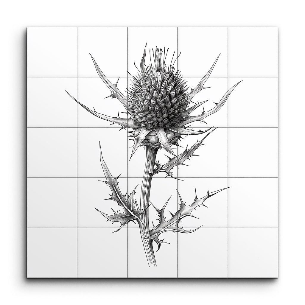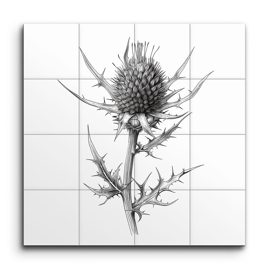 Transform your space with this striking tile mural featuring a meticulously detailed black and white illustration of a thistle plant. The artwork showcases the thistle's spiky leaves and textured, bulbous flower head with precision, creating an intricate and realistic depiction. Fine lines and shading bring depth and texture to the jagged leaves and dense florets, while the slender stem and protruding thorns add to the naturalistic beauty. This monochromatic masterpiece highlights the thistle's delicate yet bold form, making it a captivating focal point in any setting.