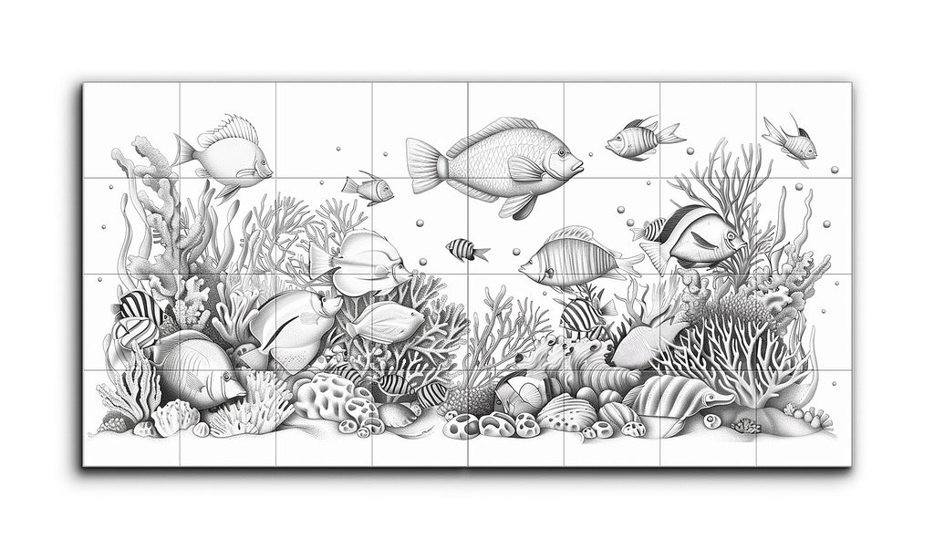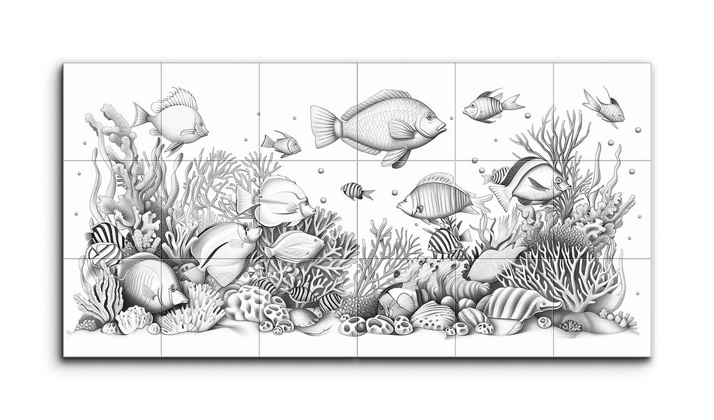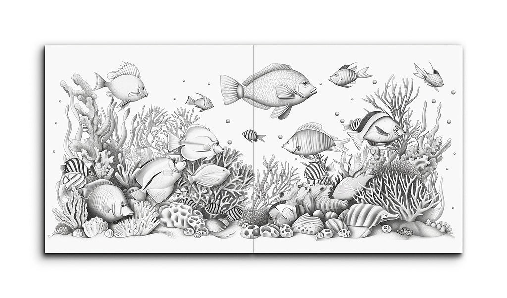 This black and white illustration captures an intricate underwater seascape, split across two panels, suggesting a diptych. The artwork is rich with marine life and coral reef imagery, featuring a variety of coral species with detailed patterns and textures. Among the corals, different types of fish are depicted, ranging from larger, scaled fish to smaller, streamlined ones with distinct stripes and patterns. The dynamic composition, with elements positioned at various angles, creates a sense of movement and depth. The meticulous attention to detail and use of shading and fine lines lend a realistic, three-dimensional appearance to the scene, while a touch of stylization adds an artistic flair to the naturalistic depiction of marine life.