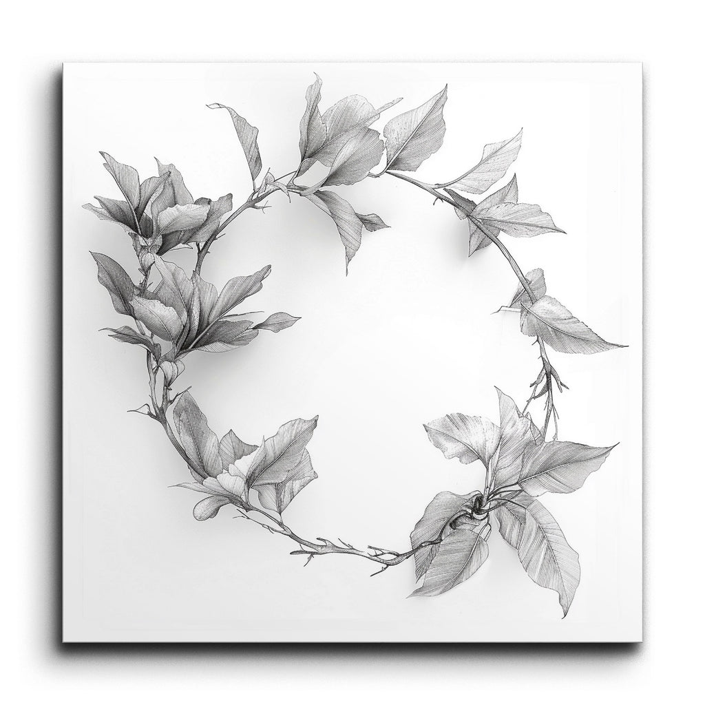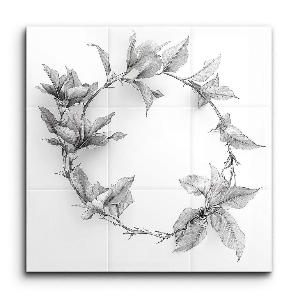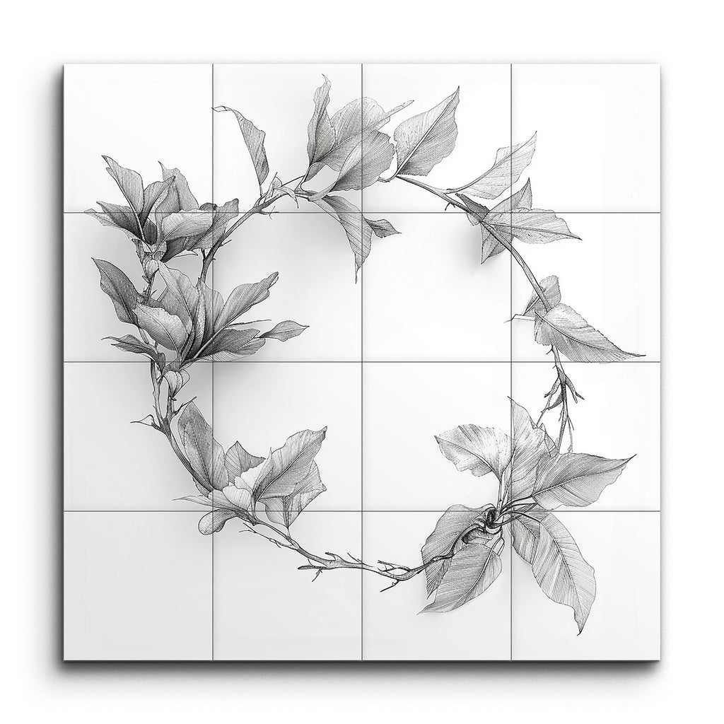 Transform your space with this exquisite tile mural featuring a delicately intricate wreath of leaves and branches. The highly detailed and realistic artwork showcases fine lines and shading that bring the leaves to life, creating a three-dimensional effect. With a harmonious composition of mature and youthful leaves intertwined in a circular shape, this monochromatic piece in shades of gray exudes elegance and subtlety, adding a touch of natural beauty and sophistication to any setting.