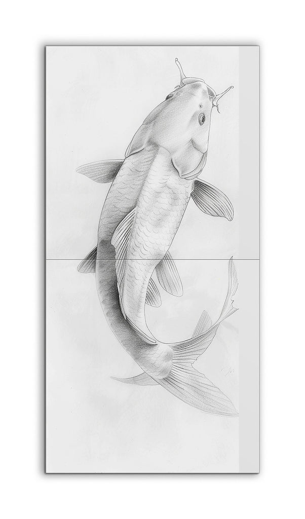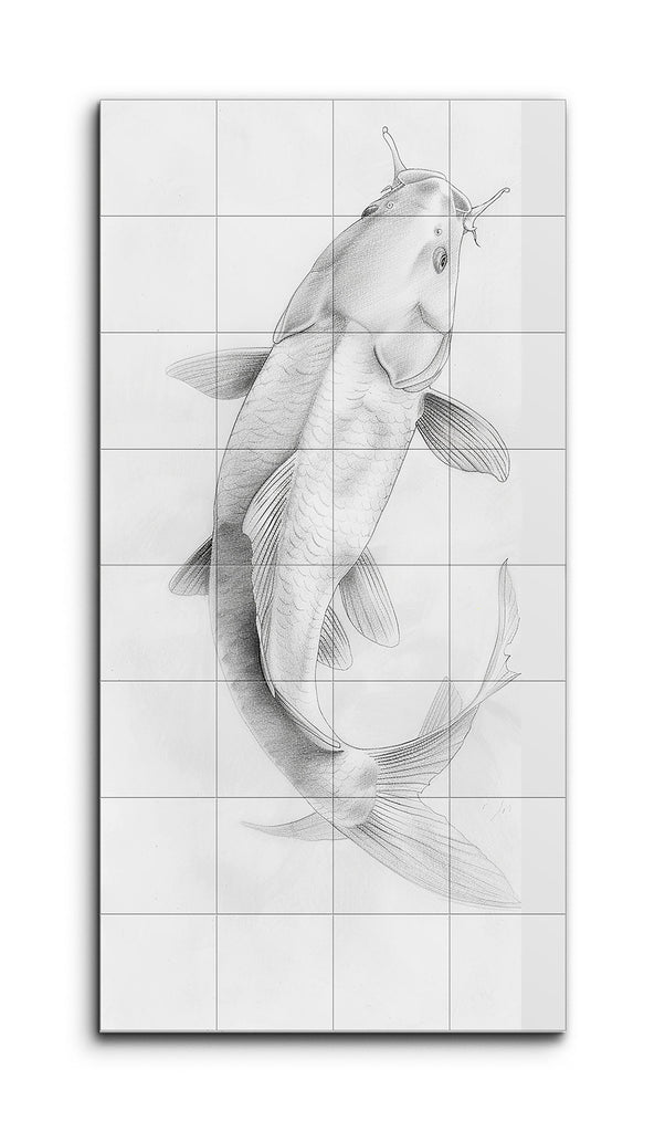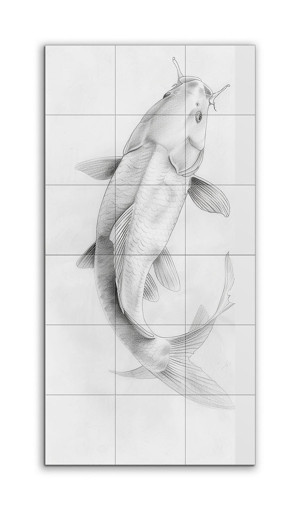 This tile mural features a detailed pencil drawing of a koi fish, rendered with intricate lines and shading. The fish is depicted in a dynamic pose, its body slightly curved and fins splayed, suggesting movement. The artist's skillful attention to anatomical accuracy is evident in the finely detailed scales, fins, and barbels near the mouth. The shading adds depth and dimension, while the delicate lines of the fins and tail highlight their translucent nature, capturing the koi's grace and elegance.