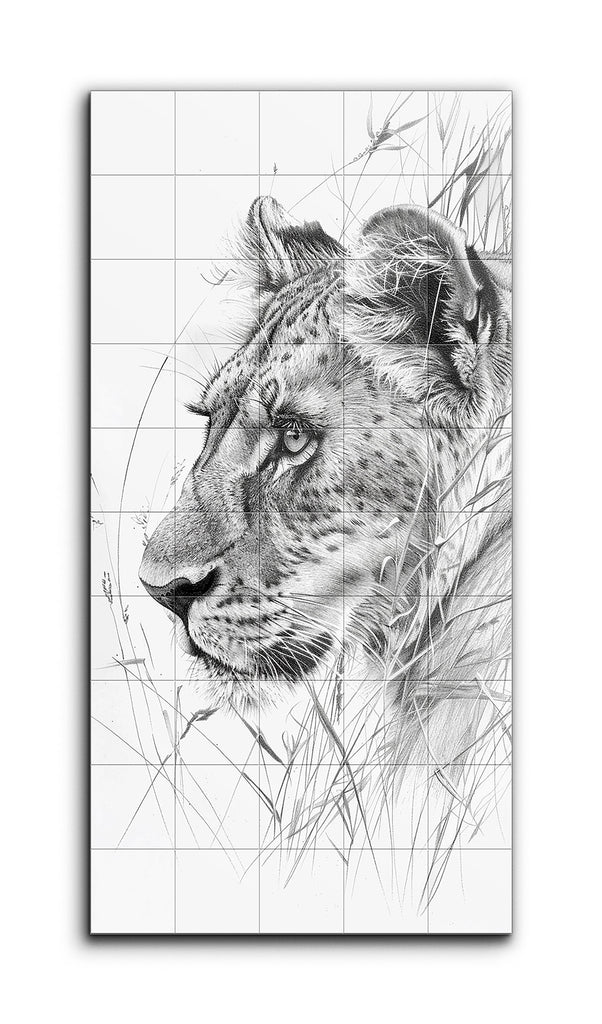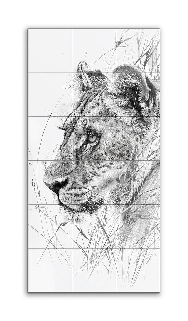 This tile mural showcases a hyper-realistic black-and-white drawing of a lioness, with her head in profile facing left. The meticulous rendering captures the texture of her fur and the intricate patterns of her coat. Striking, lifelike eyes draw immediate attention, while delicate blades of grass surround her, adding natural context and enhancing realism. The balanced composition, with the lioness's head slightly off-center, creates a dynamic visual effect, emphasizing fine details and lifelike representation.