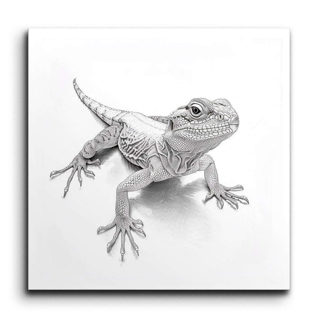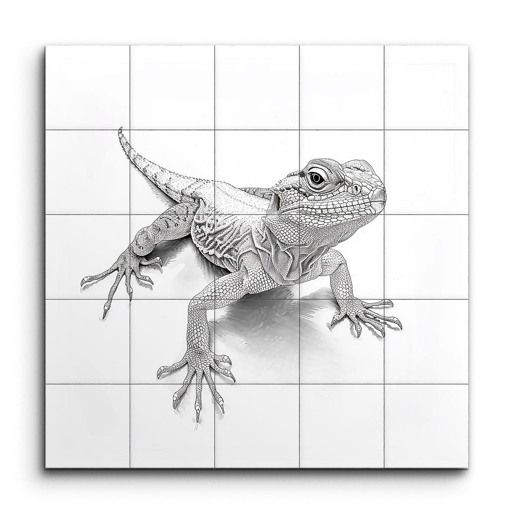 Transform your space with this captivating tile mural featuring a hyper-realistic lizard. The artwork captures the lizard in a three-quarter view, its head turned slightly towards the viewer, showcasing meticulously rendered scales and natural patterns. Expert shading and detailed limbs create a lifelike stance, while the striking eyes add an almost glossy realism. Monochromatic tones emphasize the intricate textures and forms, making this piece a stunning focal point for any room.