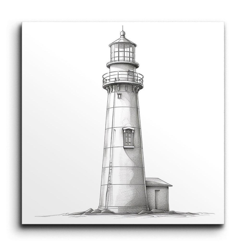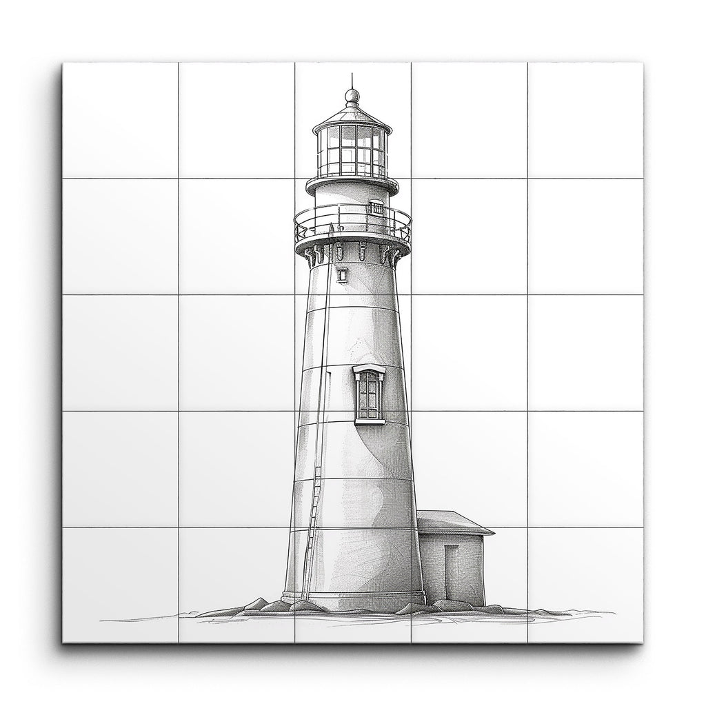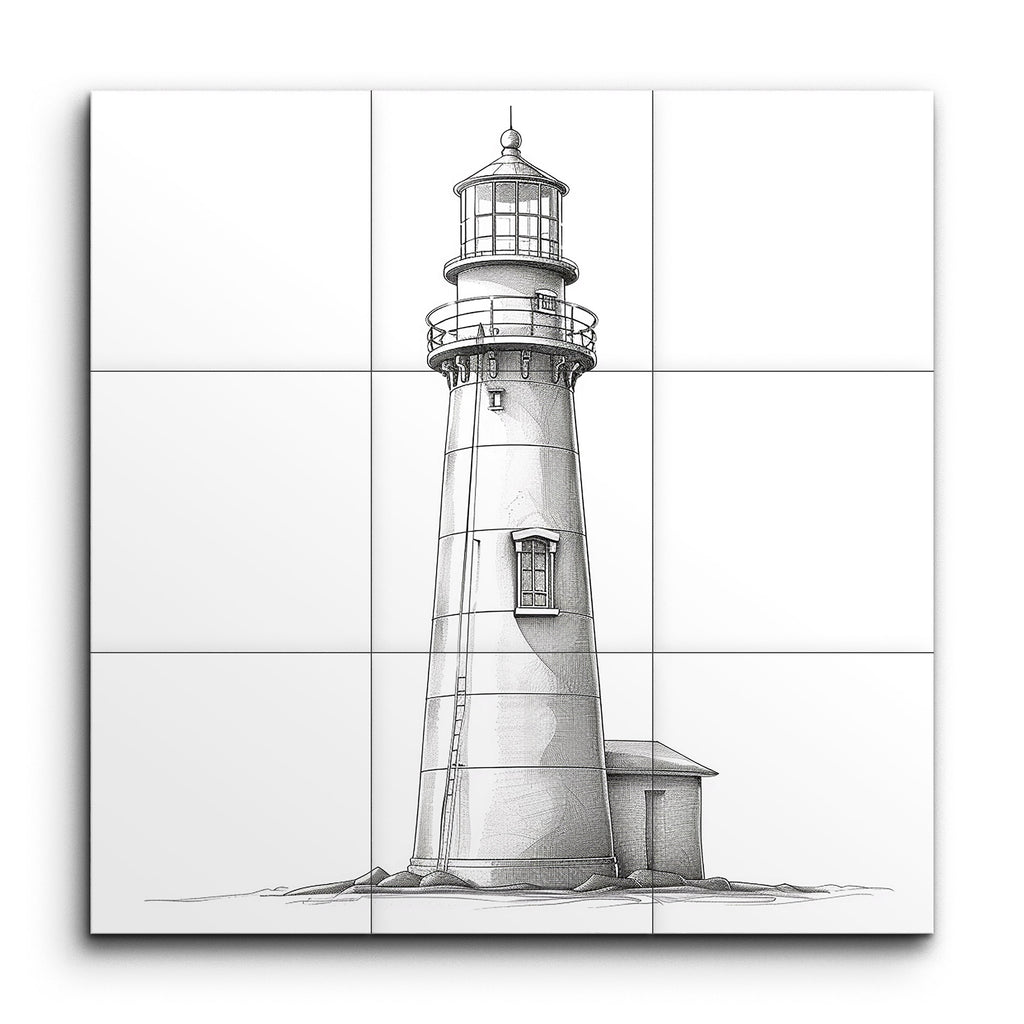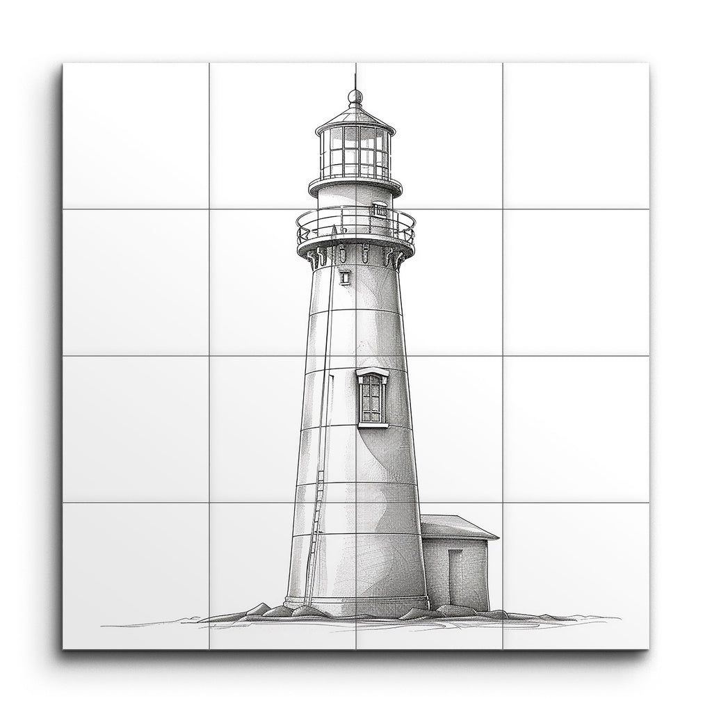 Illuminate your space with our stunning tile mural, featuring a meticulously detailed line drawing of a lighthouse. This artwork captures the majestic structure with crisp, clean lines, showcasing the lantern room, gallery, and tapered cylindrical body. Adjacent, a quaint building adds charm, while precise shading lends depth and dimension. Perfect for those who appreciate architectural beauty and classic, monochromatic elegance, this mural is a timeless addition to any decor.