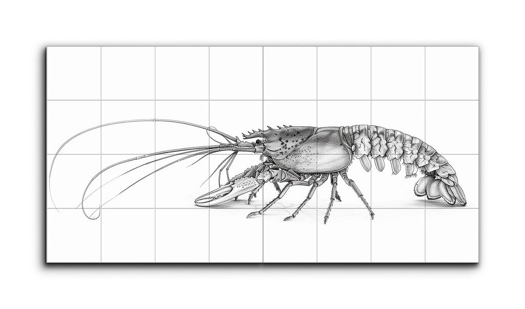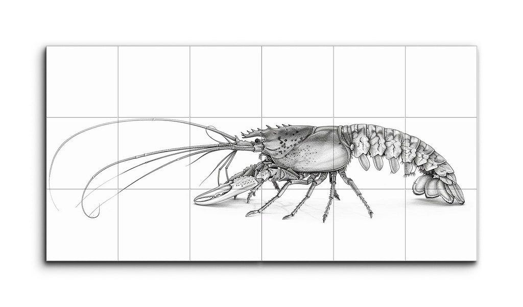 This tile mural showcases a meticulously detailed and anatomically precise illustration of a lobster. Rendered in grayscale, the monochromatic artwork captures the intricate textures and patterns of the lobster's exoskeleton, from its segmented body and long antennae to its spiny legs and claws. The fine lines and careful shading create a three-dimensional effect, giving a sense of depth and potential movement. This piece exemplifies the beauty and complexity of biological illustration, skillfully blending scientific accuracy with artistic finesse.