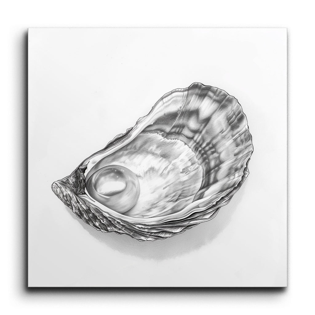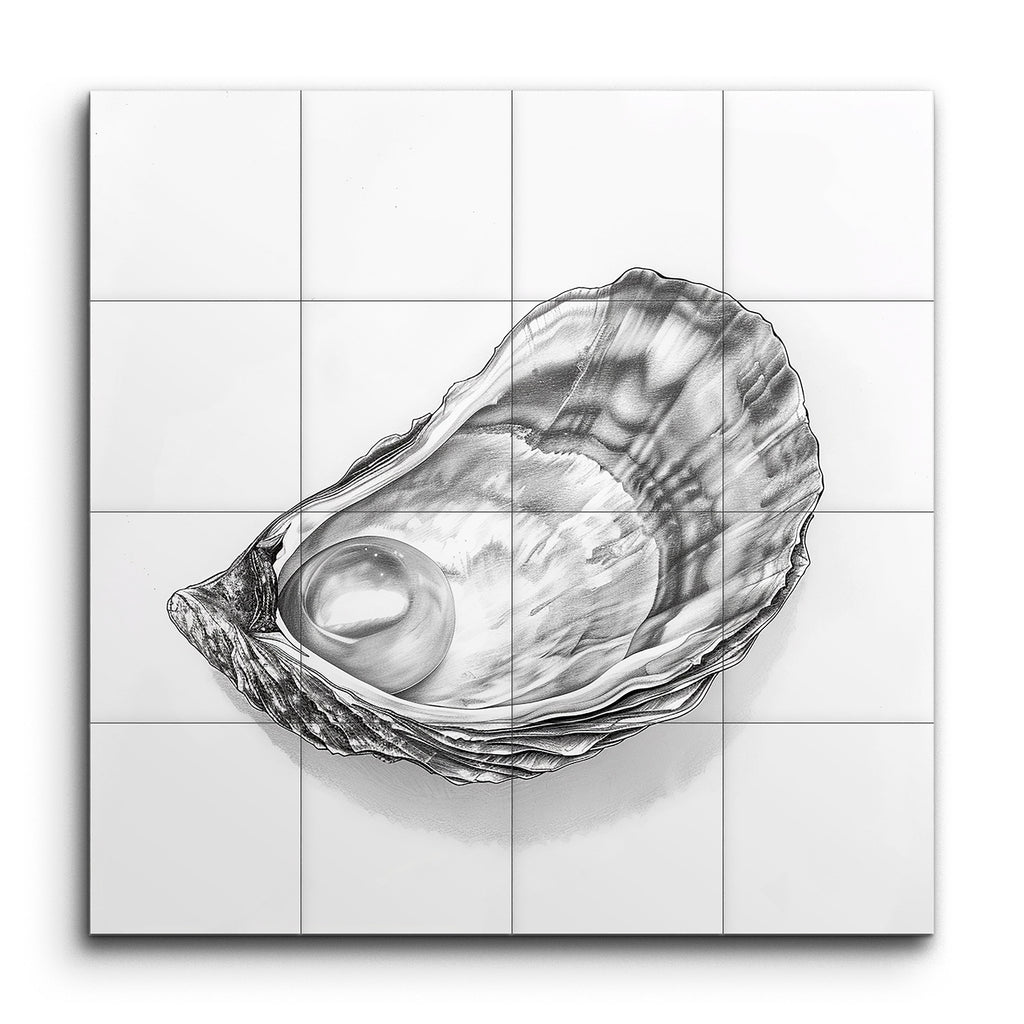 Transform your space with this stunning tile mural, showcasing a hyper-realistic black-and-white illustration of an open oyster shell cradling a lustrous pearl. Intricate textures and meticulous shading bring the natural ridges and grooves of the shell to life, while the smooth, reflective inner surface hints at the iridescent beauty of mother-of-pearl. The gleaming pearl, with its polished surface, and the masterful use of light and shadow, create a captivating, three-dimensional effect that adds depth and elegance to any setting.