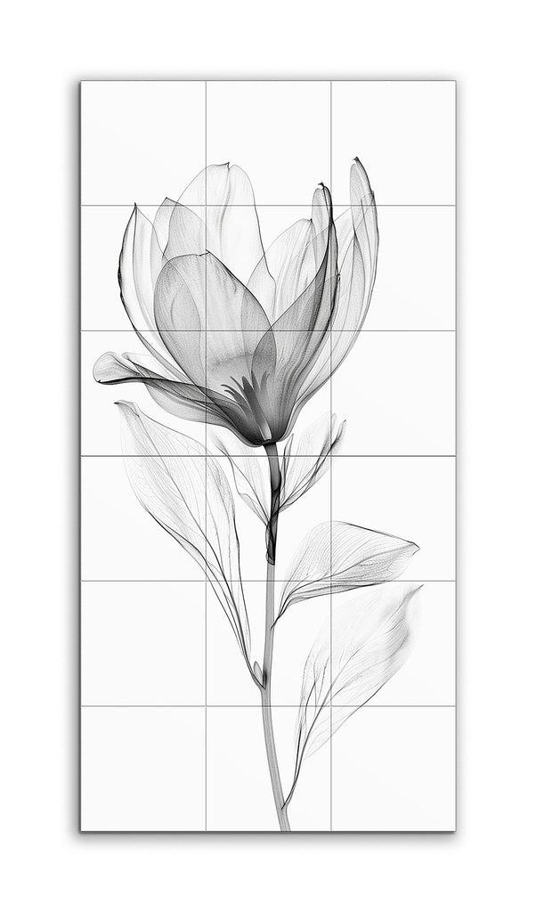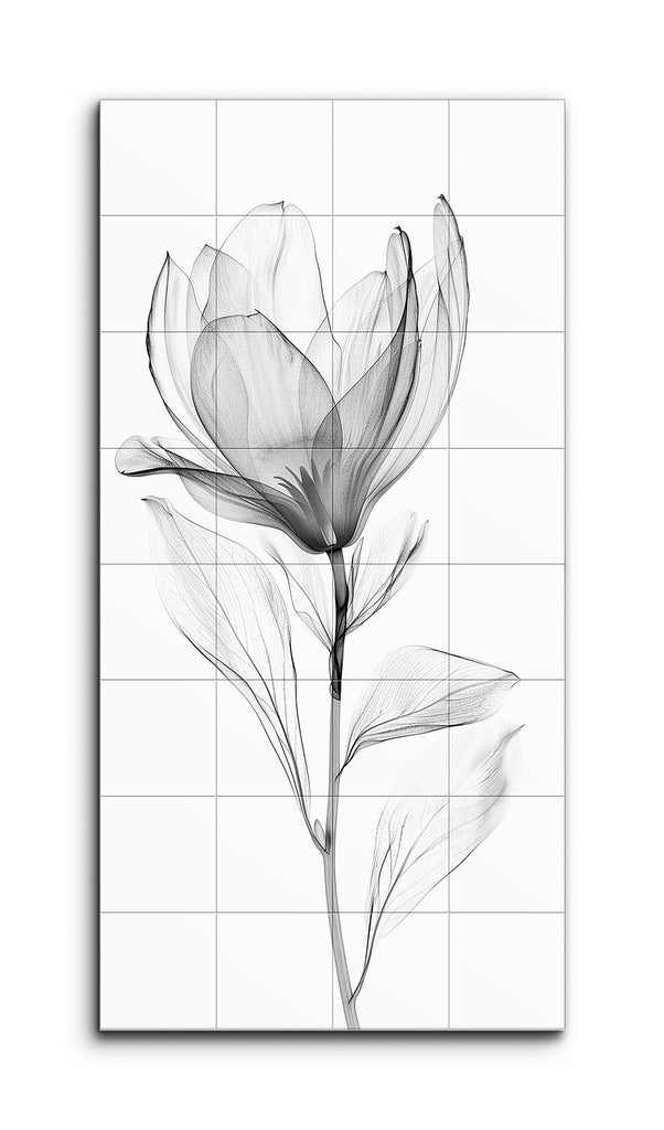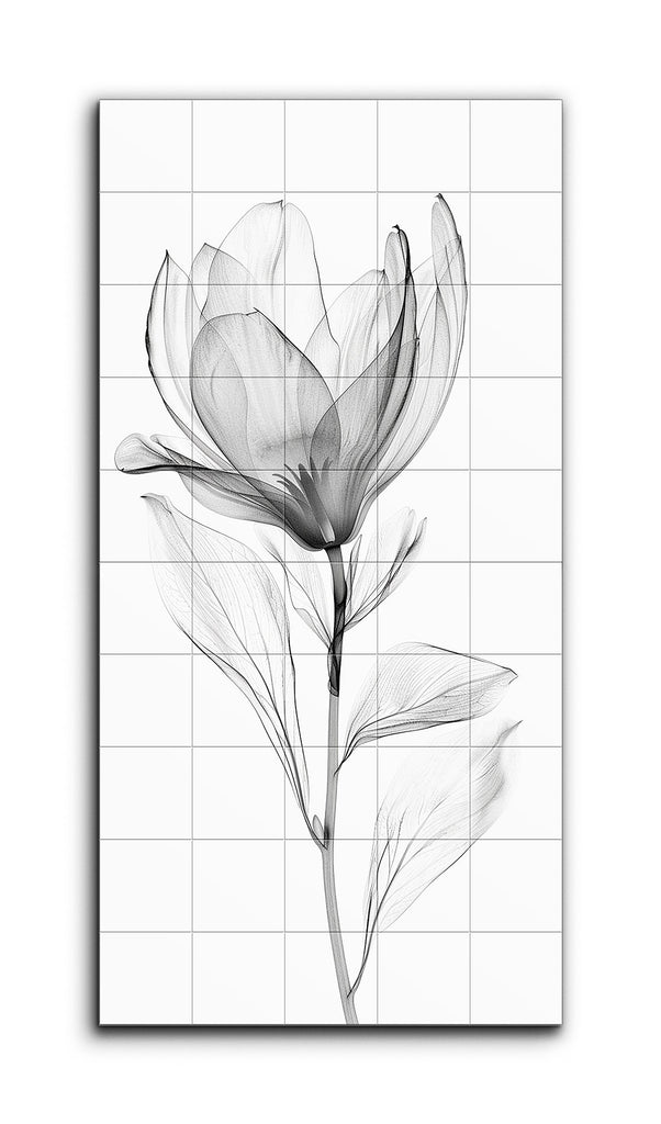 This tile mural features an exquisitely detailed magnolia flower rendered in a monochromatic palette. Delicate, fine lines create a sense of transparency and lightness, as if the petals and leaves are made of sheer fabric or glass. The layered petals, with darker inner and lighter outer ones, add depth and dimension. The stem and elongated, veined leaves are gracefully detailed, enhancing the realistic yet ethereal quality. The minimalist, modern style and balanced composition evoke calm and serenity.