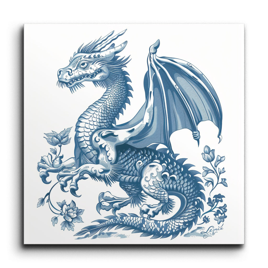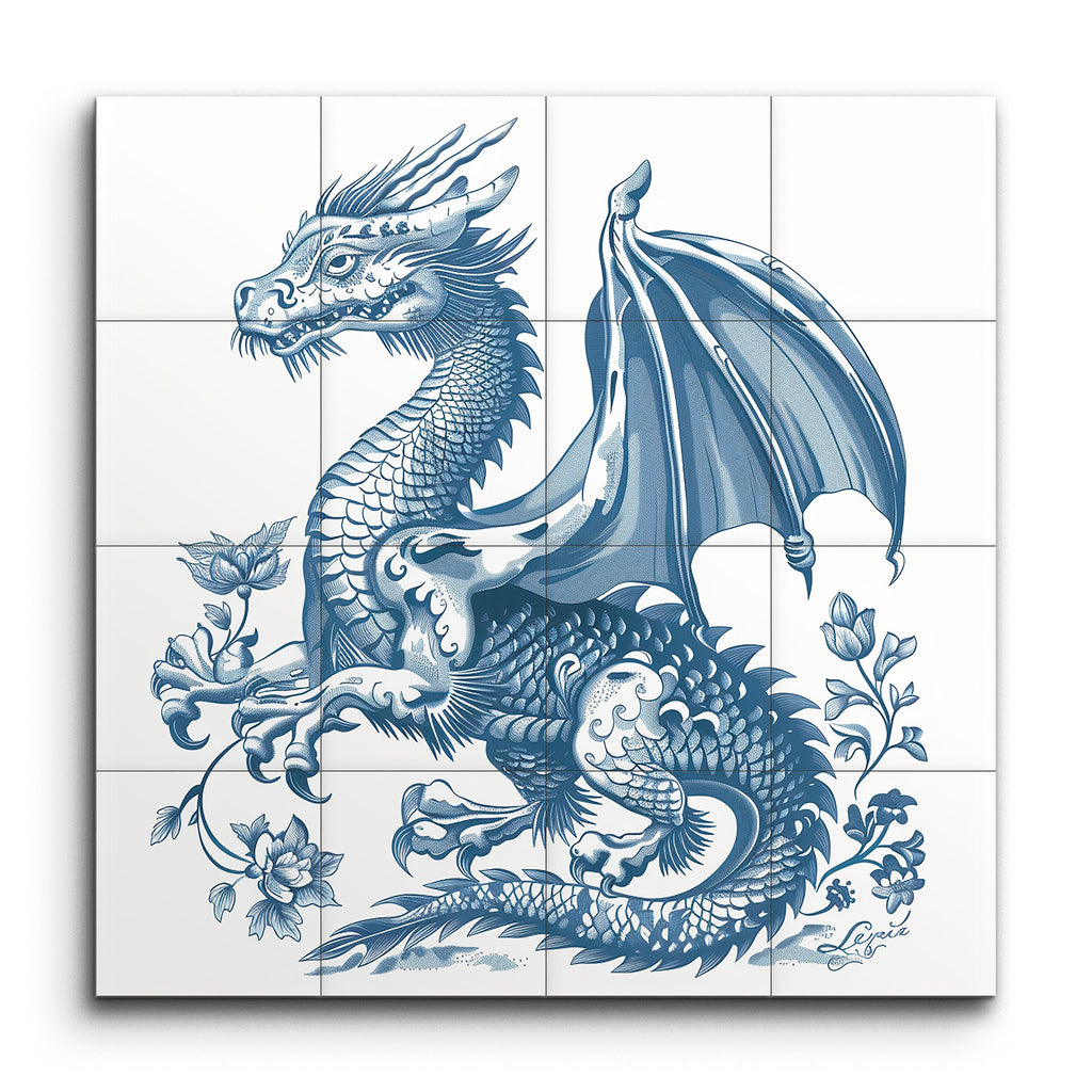 Immerse yourself in the timeless elegance of this stunning tile mural, featuring a meticulously detailed dragon rendered in striking shades of blue. The dragon’s intricately scaled body, sharp horns, and expressive eyes exude a fierce and majestic aura, while its partially spread wings and gracefully curling tail add dynamic movement. Surrounding the dragon, delicate floral elements in matching blue tones introduce a contrasting softness, achieving a harmonious balance reminiscent of traditional Asian art and Chinese porcelain designs.