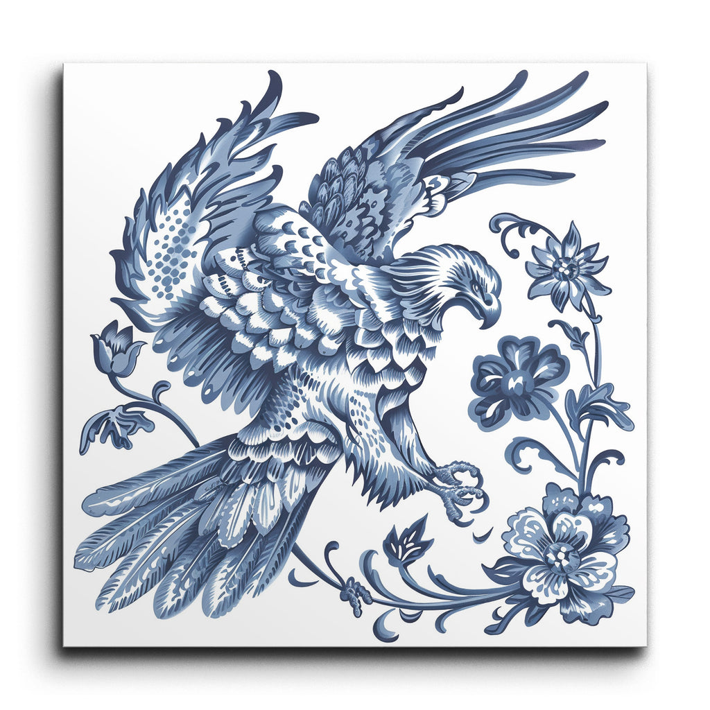 Elevate your space with this stunning tile mural featuring a majestic eagle in mid-flight, surrounded by intricate floral elements. Rendered entirely in shades of blue, the artwork combines realism with decorative patterns to create a visually striking and harmonious composition. The eagle's detailed feathers and powerful wings are beautifully complemented by delicate petals and intertwined foliage, reminiscent of traditional blue and white porcelain designs. This mural is a captivating blend of elegance and dynamism.