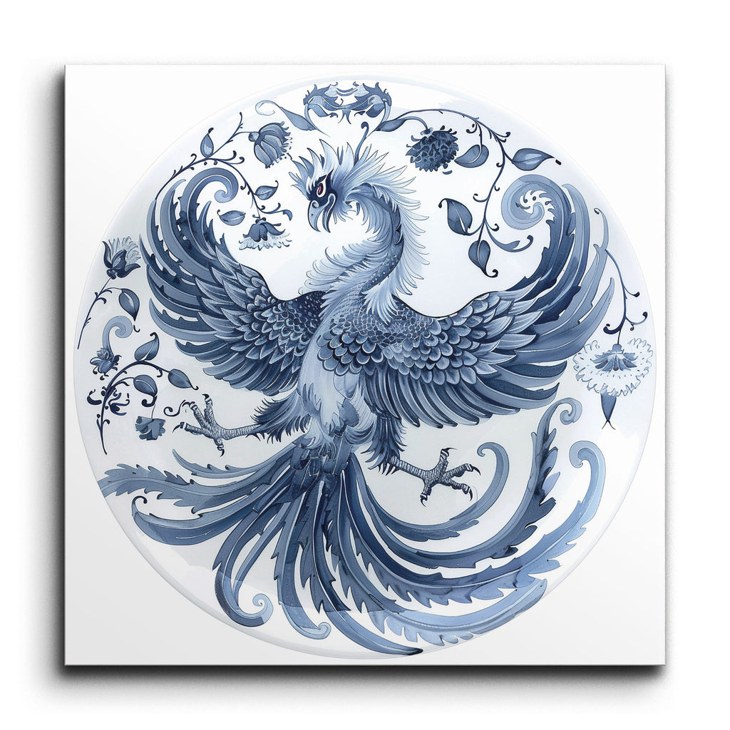 Immerse yourself in the elegance of this tile mural, featuring a breathtaking depiction of a mythical bird, reminiscent of a phoenix, in stunning shades of blue and white. The bird's wings are majestically spread, its tail feathers curling with intricate detail, creating a sense of depth and movement. Delicate floral elements—vines, leaves, and blossoms—intertwine with the bird, harmonizing the design. The traditional porcelain-inspired style, with its fluid lines and fine brushwork, evokes timeless sophistication.