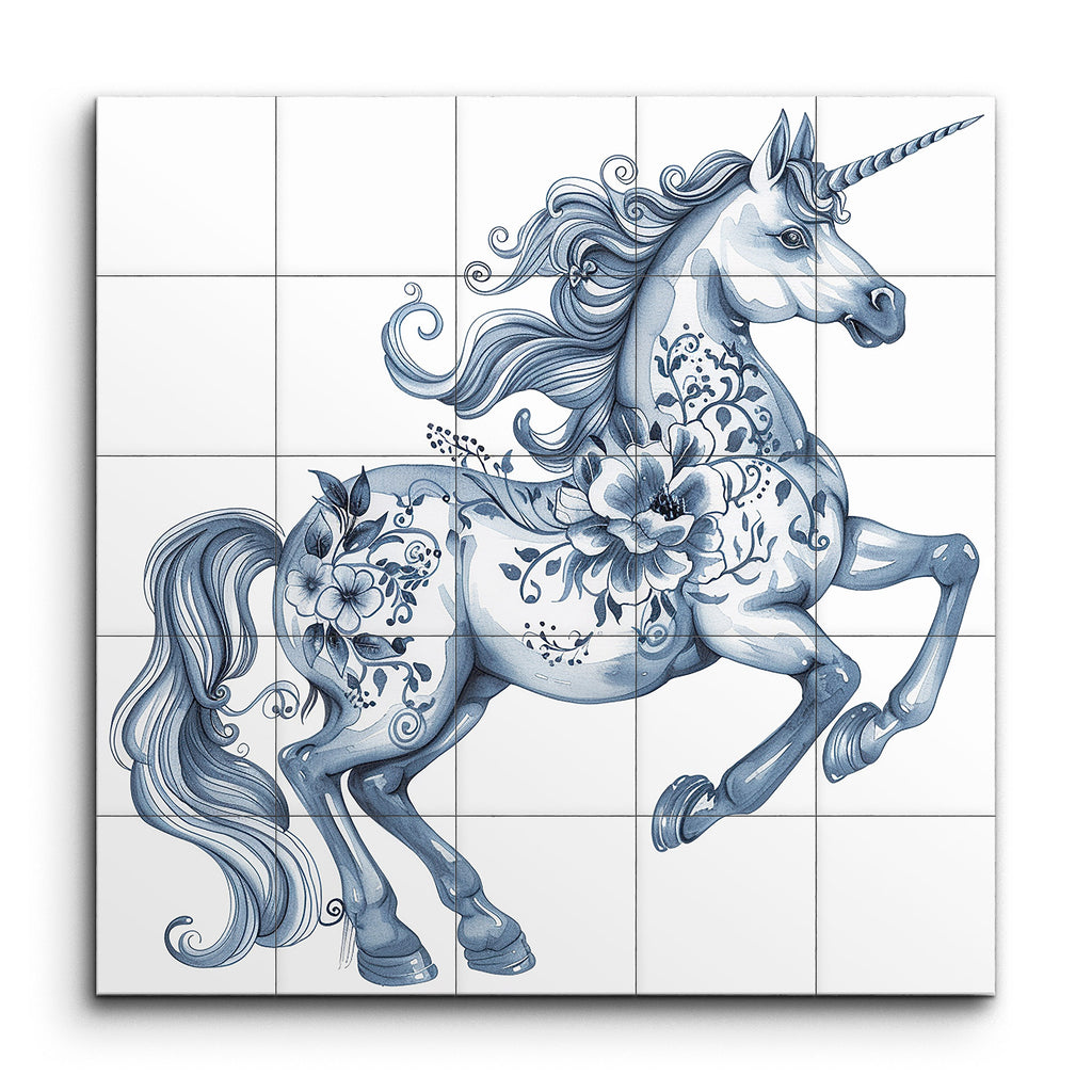 Transform your space with this exquisite tile mural, featuring a majestic unicorn in a monochromatic blue palette. The unicorn, rearing up on its hind legs, boasts a flowing mane and tail, adorned with intricate floral patterns of large blossoms and delicate vines. Reminiscent of traditional porcelain or Delftware, the artwork's clean lines and refined detailing blend whimsy with sophistication. This piece captures the mythical essence of the unicorn, enhanced by delicate floral beauty and subtle shading.