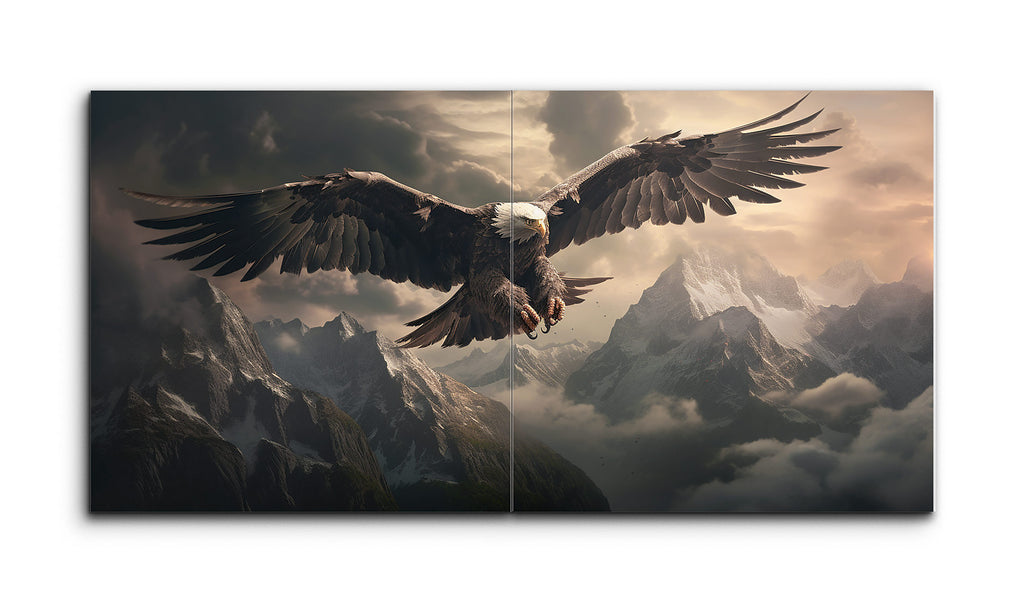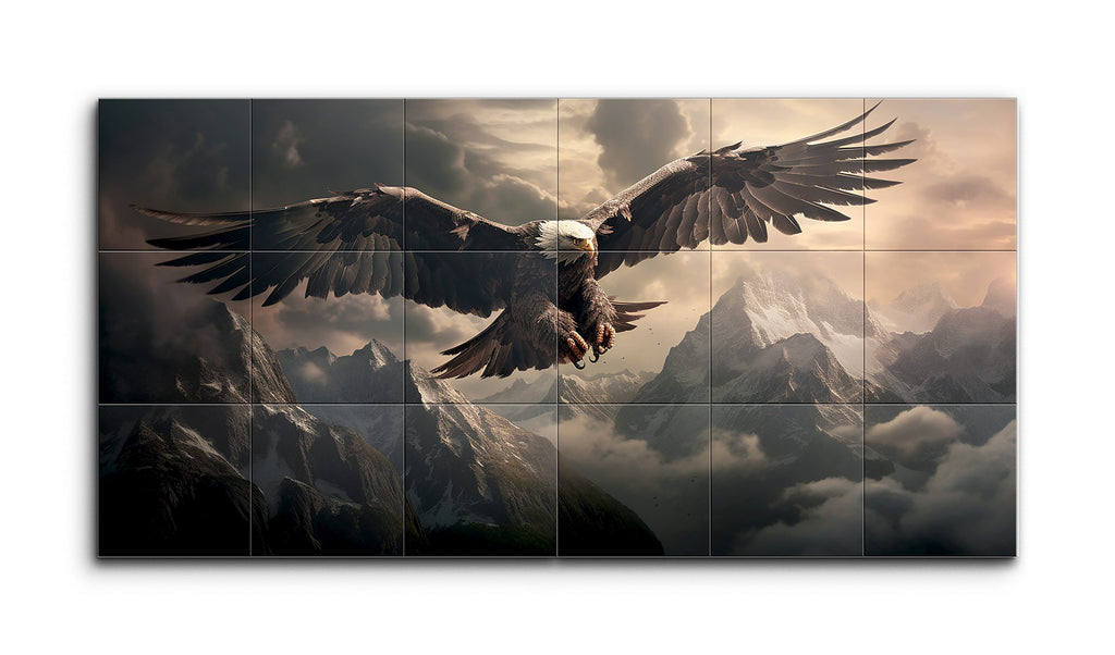 This tile mural captures a majestic eagle in mid-flight over a dramatic mountainous landscape. The eagle's powerful wingspan, sharp talons, and keen eyes are depicted with impressive detail, showcasing its strength and grace. Towering, snow-capped mountains shrouded in mist and clouds create depth and grandeur. Dynamic lighting casts a warm, golden glow on the eagle and peaks, adding mystery and drama. The hyperrealistic style emphasizes intricate details and lifelike textures, evoking awe and reverence for nature.