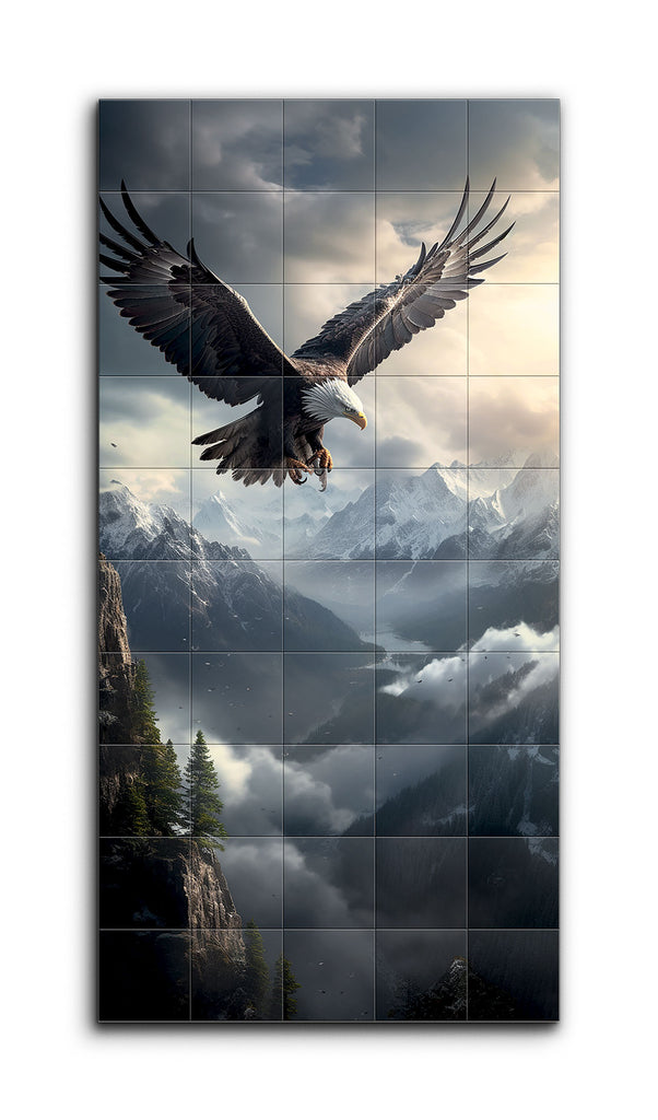 This tile mural captures a majestic eagle soaring above a breathtaking mountainous landscape. The eagle, with its fully extended wings, detailed feathers, and powerful presence, dominates the upper portion. The bird's sharp beak and focused eyes convey determination and freedom. Below, an expansive mountain range with snow-capped peaks and a dense forest of evergreens adds depth and texture. The sky features a dynamic blend of light and stormy clouds, enhancing the sense of realism and drama. The artwork's rich, natural color palette and meticulous detail highlight the beauty and wild spirit of nature.