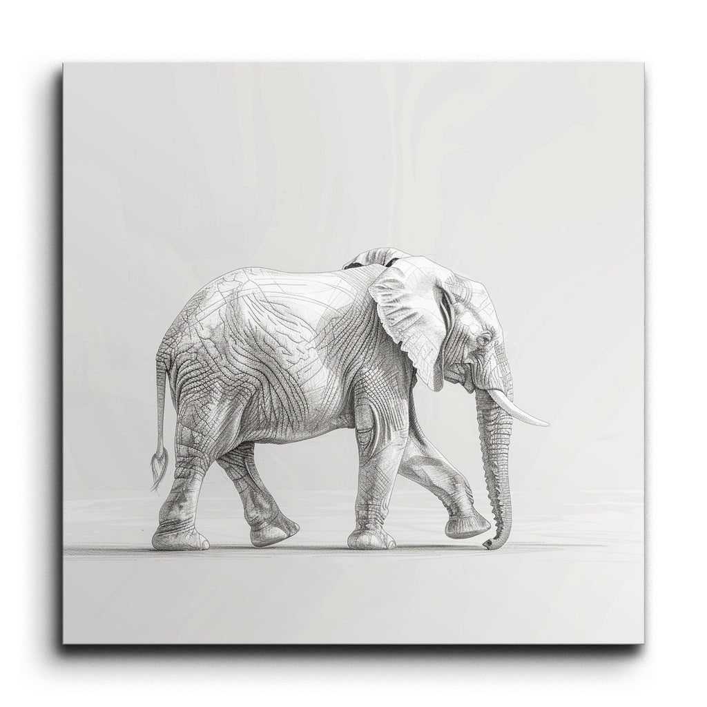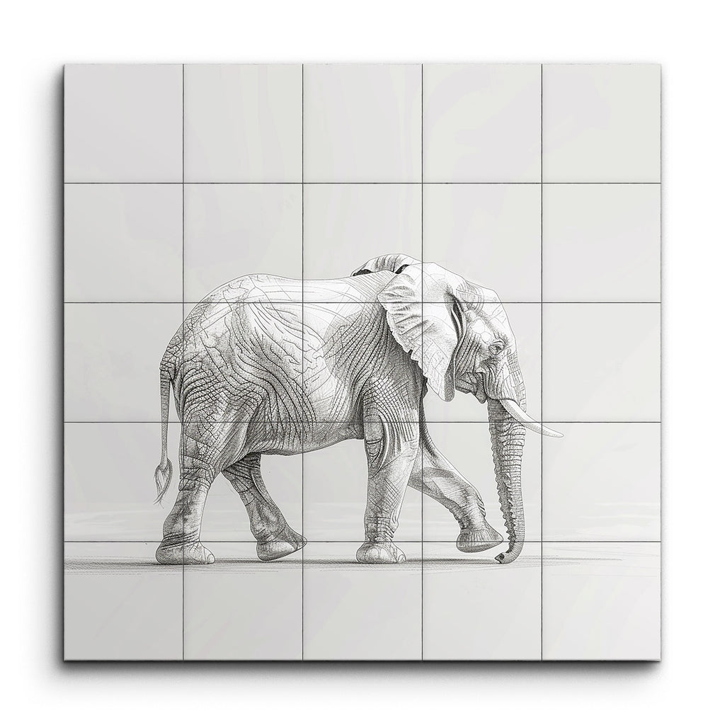 Transform your space with this stunning tile mural featuring a meticulously detailed sketch of an elephant. Captured in a minimalist style, the artwork showcases the elephant in profile, walking gracefully towards the right. The fine lines and expert shading bring out the intricate textures of its skin, highlighting every wrinkle and fold. With long, curved tusks and slightly flared ears, this monochromatic masterpiece emphasizes the natural beauty and majesty of one of nature's most magnificent creatures.