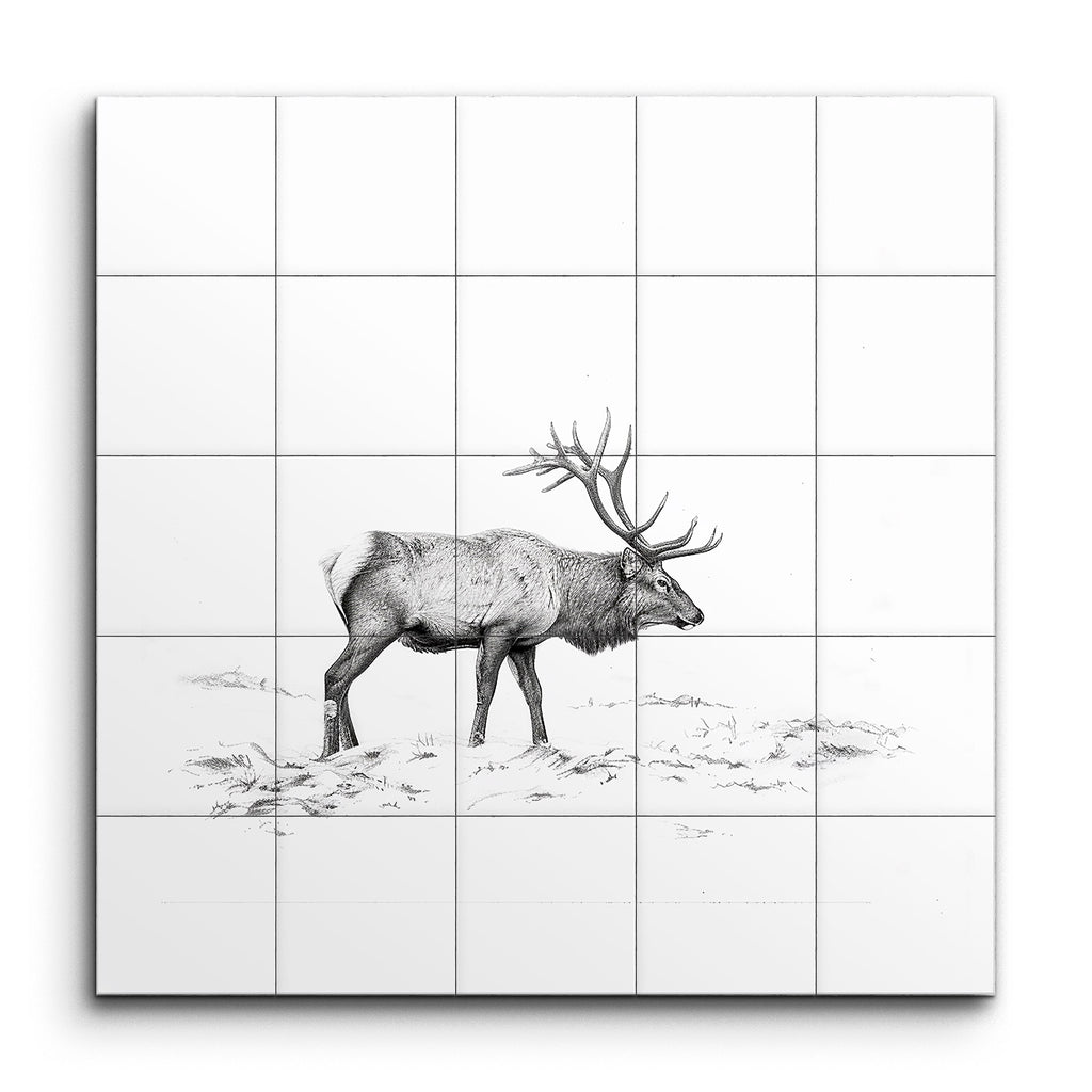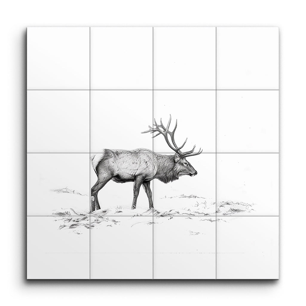 Transform your space with our captivating tile mural, featuring a lifelike illustration of a majestic elk. Rendered in meticulous detail, the artwork captures the elk in profile, highlighting its textured fur, muscular build, and intricately branched antlers. The subtle play of light and shadow adds depth, bringing the scene to life. The minimalist background ensures the focus remains on the elk's stunning form, making this mural a striking centerpiece that celebrates the beauty of nature.