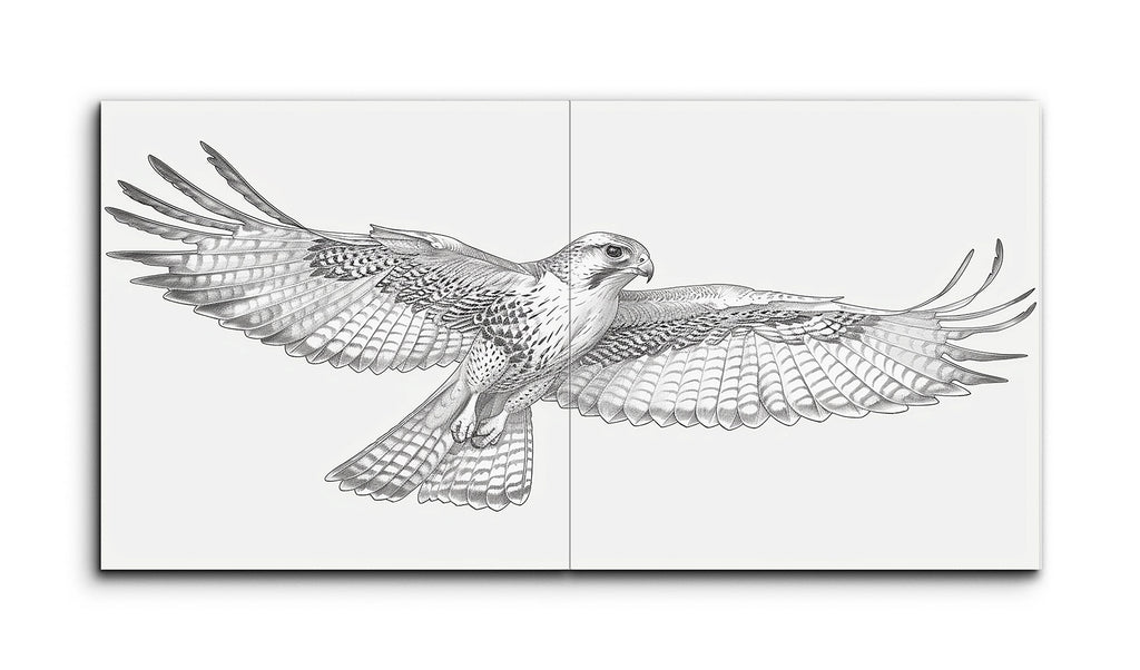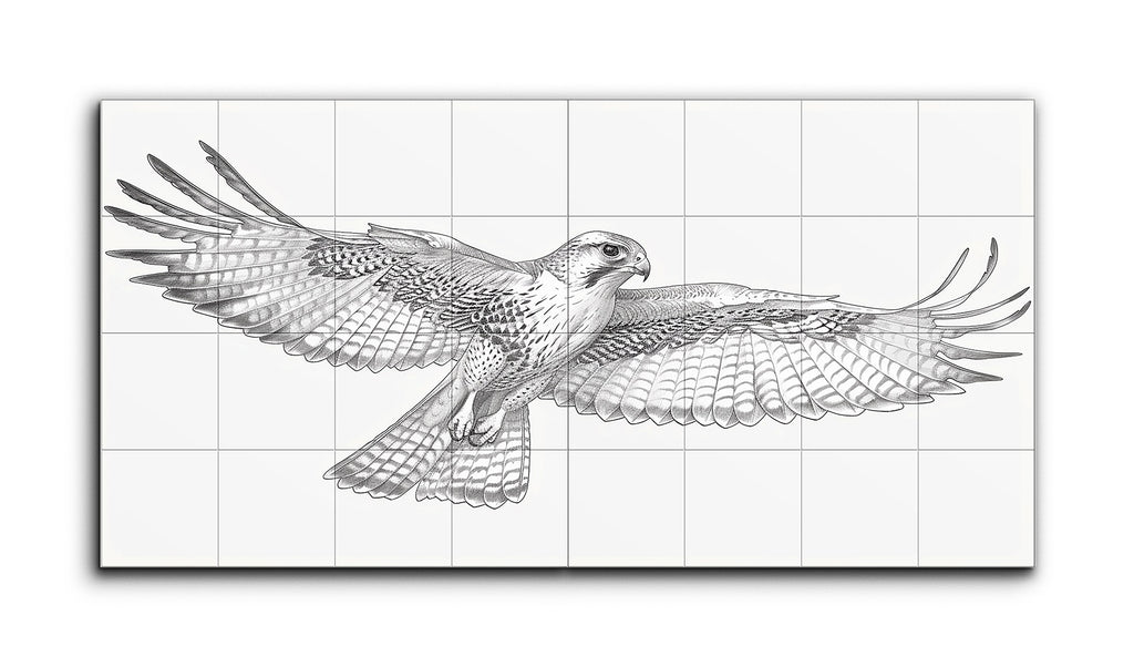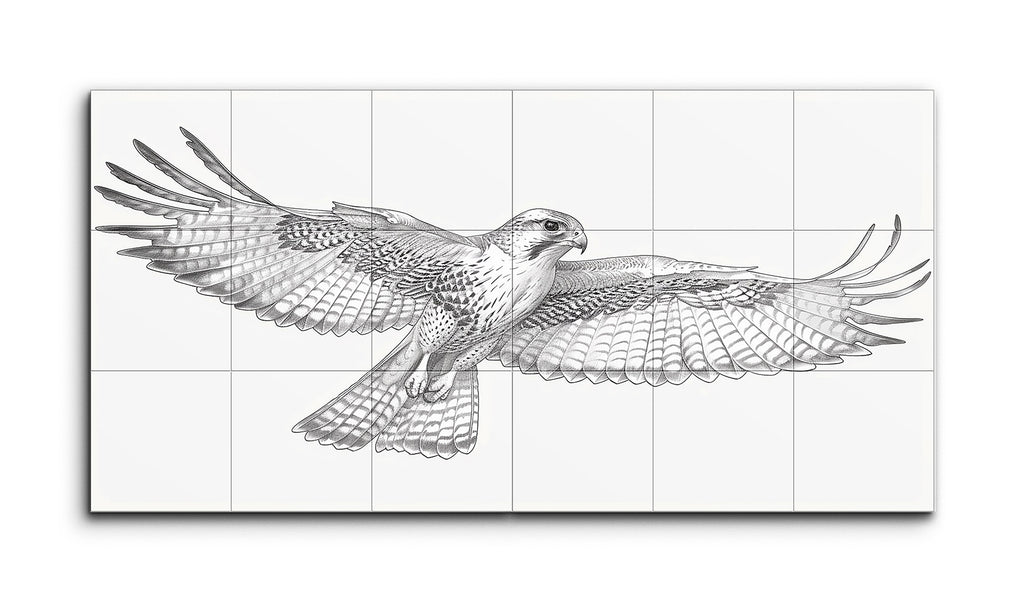 This monochromatic tile mural features a highly detailed drawing of a bird of prey, likely a falcon, in mid-flight with wings fully extended. The realistic style highlights intricate details of the bird's feathers, eyes, and beak against a white background. Fine lines and meticulous shading give a sense of texture and depth, capturing the bird's sleek form and focused expression. The scene evokes the precision of scientific illustrations, celebrating the beauty and grace of these majestic creatures.