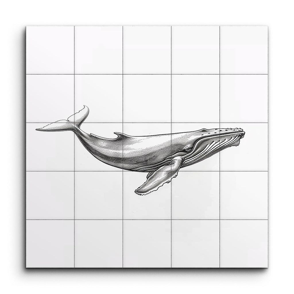 Immerse yourself in the majesty of the ocean with this stunning tile mural featuring a meticulously detailed illustration of a humpback whale. Rendered in a realistic style, the whale gracefully swims from left to right, its smooth, streamlined body captured with expert precision. The artist's use of fine cross-hatching and stippling techniques brings the whale to life, highlighting its flippers, tail, and distinctive throat pleats. The monochromatic tones lend a timeless elegance, allowing you to appreciate every intricate detail and the lifelike representation of this magnificent creature.