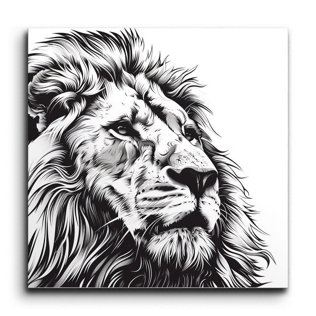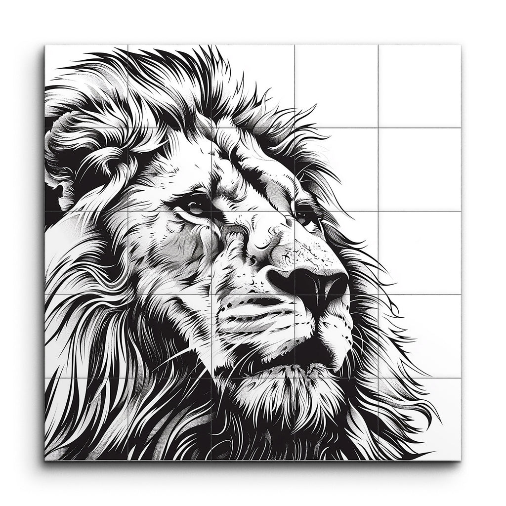 Transform your space with this captivating tile mural featuring a highly detailed black and white illustration of a lion's head. The realistic rendering captures the majestic essence of the lion, with intricate line work that brings the texture of its fur and the contours of its face to life. The flowing mane adds a sense of movement and depth, while the calm, regal expression and intense eyes imbue the piece with a lifelike presence. This artwork, reminiscent of classic pen and ink drawings, exudes elegance and sophistication.