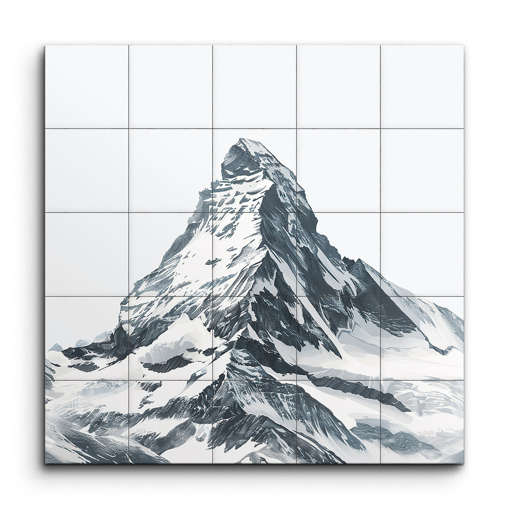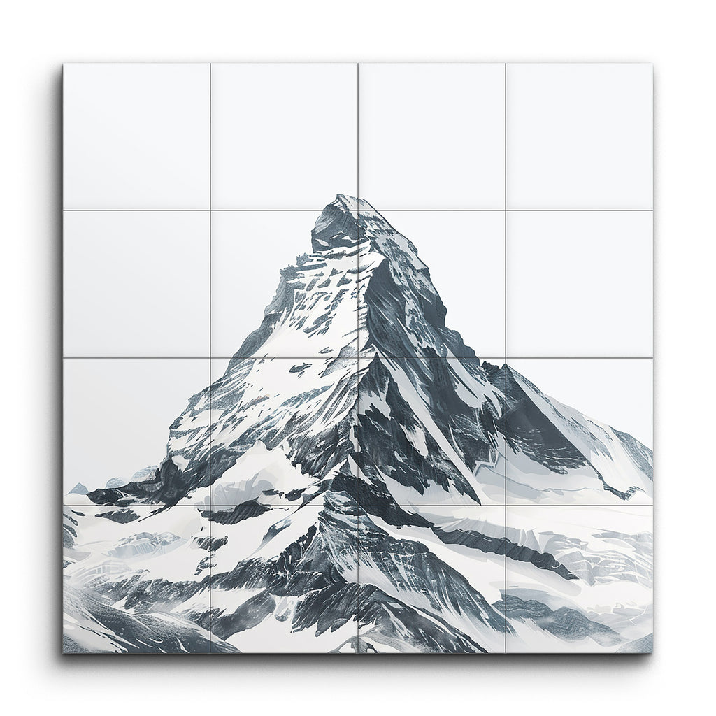Elevate your space with this stunning tile mural capturing the serene beauty of a majestic mountain peak, reminiscent of the iconic Matterhorn. Rendered in a minimalist and modern style, the artwork features sharp, angular lines and a refined color palette of grays and whites, emphasizing the snow-covered slopes and rugged outcrops. The masterful use of light and shadow creates a striking three-dimensional effect, drawing viewers into the grandeur and tranquility of the alpine landscape.