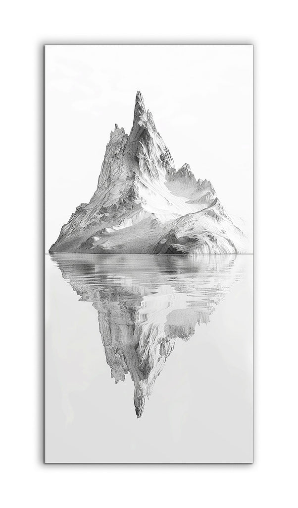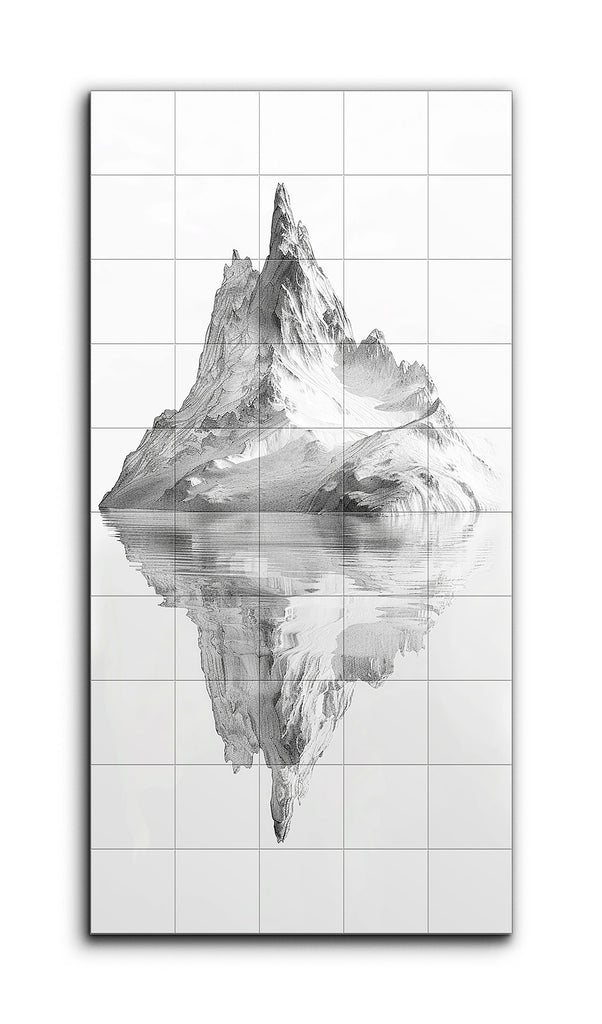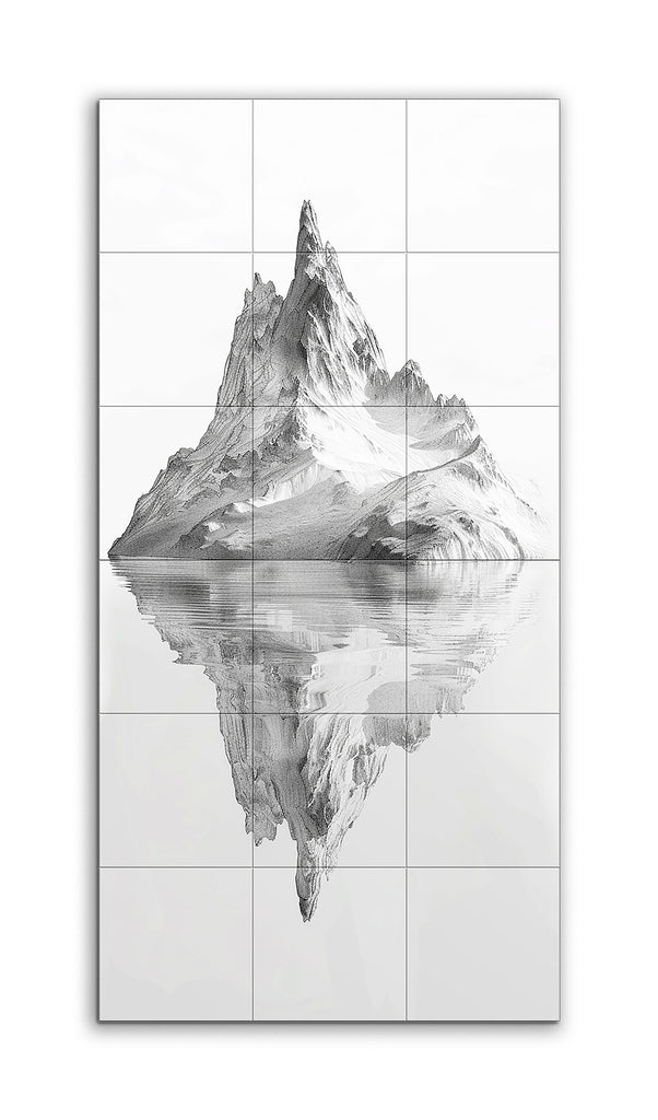 This tile mural showcases a majestic mountain peak, intricately detailed with sharp, jagged edges that exude rugged grandeur. Rendered in monochromatic grayscale, the artwork emphasizes the natural beauty and form of the mountain. Below, a calm body of water creates a perfect, mirrored reflection, slightly blurred to add depth and realism. The minimalist yet detailed style, combined with the clean composition, highlights the textures and contrasts, giving the piece a timeless and serene quality.