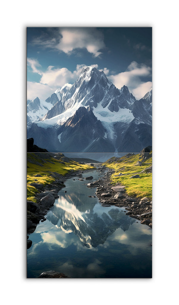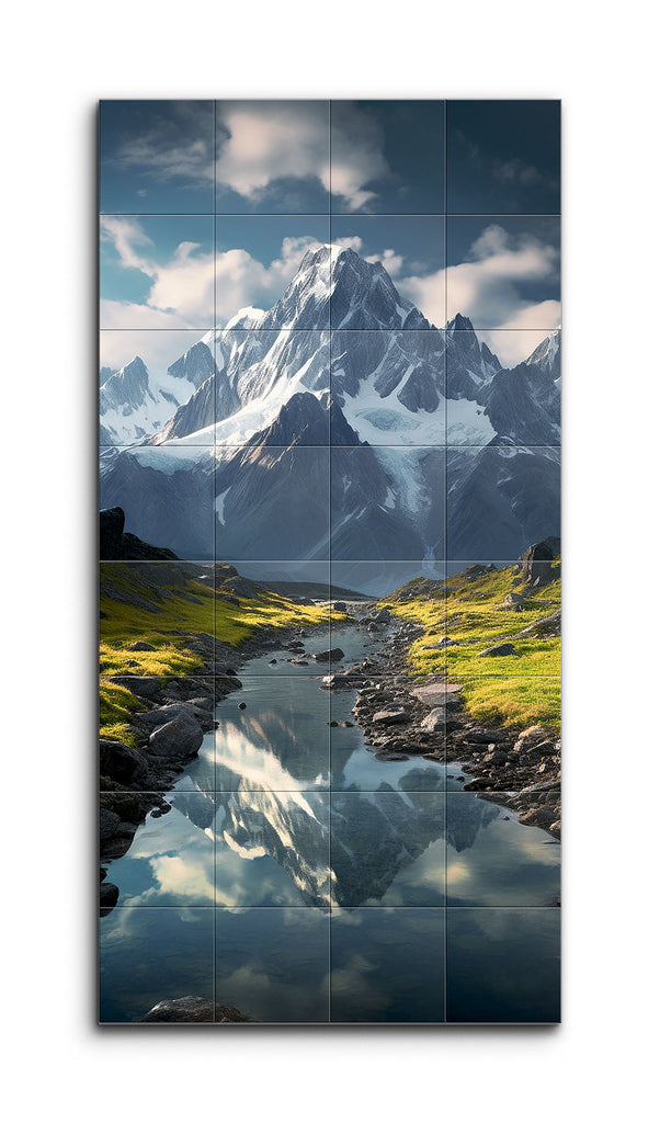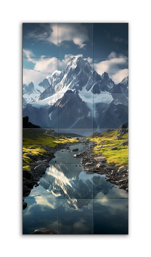 This tile mural presents a breathtaking landscape featuring a majestic mountain range with snow-capped peaks under a partly cloudy sky. The mountains are rendered in remarkable detail, showcasing their rugged and imposing nature. A clear, reflective body of water in the foreground mirrors the mountains and sky, creating a harmonious and symmetrical composition. The green grass and rocks along the riverbanks add texture and contrast to the cool tones of the scene. The artwork's realistic style and skillful use of light and shadow evoke a sense of tranquility and awe at nature's grandeur.