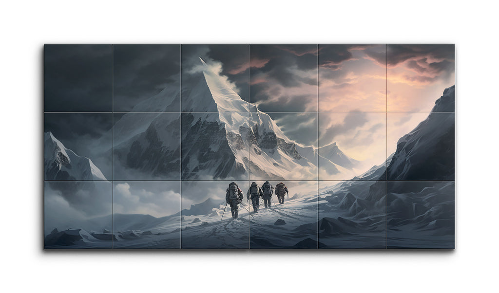 This tile mural showcases a dramatic mountain scene brought to life through digital painting. In the foreground, four mountaineers trek across a snowy landscape, their detailed gear highlighting the harsh conditions. The middle ground features a majestic, intricately detailed mountain peak with sharp edges and layers of snow. A dynamic sky in the background, with hues of pink, orange, blue, and grey, suggests a sunrise or sunset, adding depth and an evocative atmosphere to the artwork.
