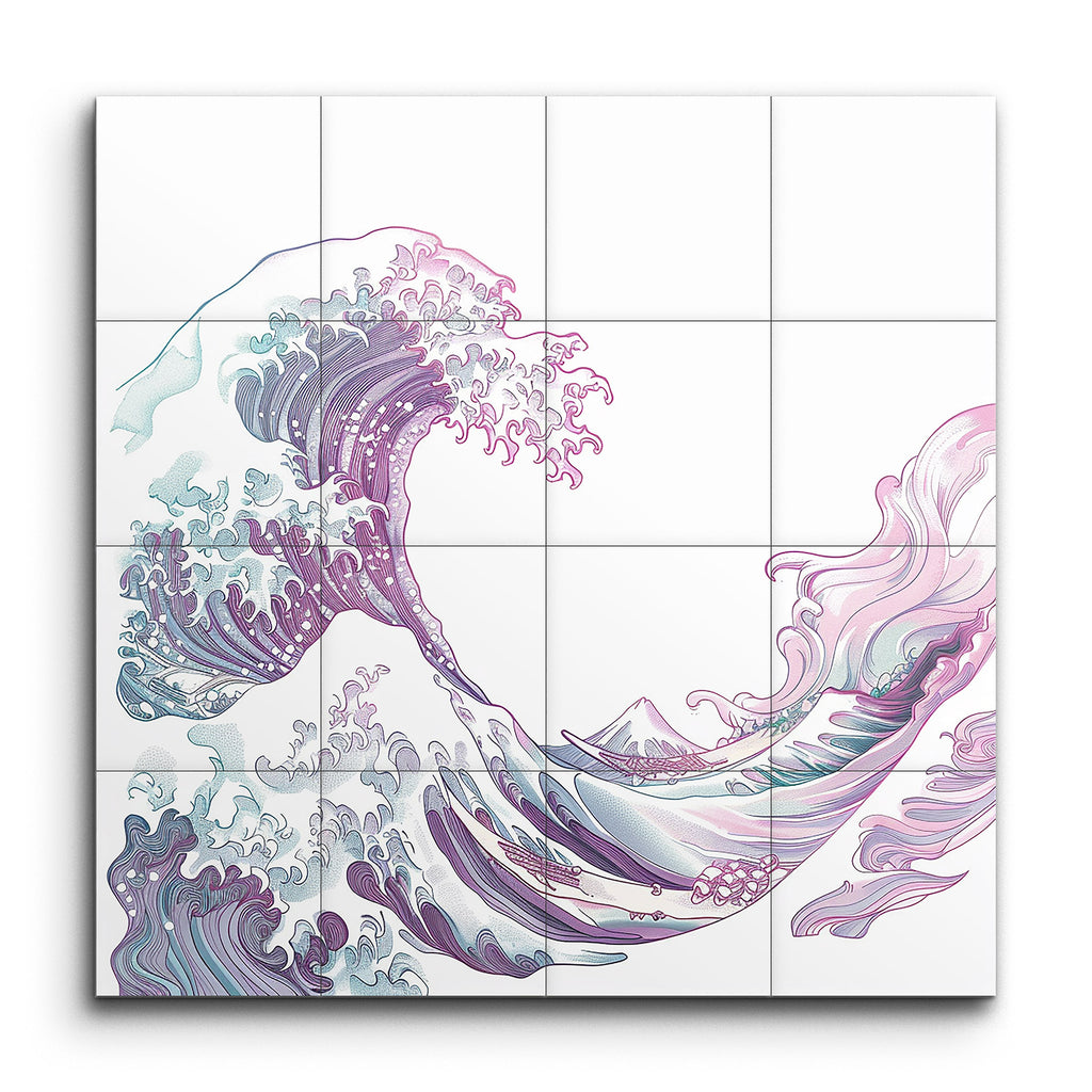 Immerse yourself in the dynamic beauty of our tile mural, featuring a modern, abstract interpretation of a majestic wave inspired by "The Great Wave off Kanagawa." This captivating artwork blends pastel shades of purple, pink, and teal to create a harmonious and elegant scene. Intricate, curling patterns in the wave's crest, along with gradients that add depth and movement, make the wave come alive. A small, simplified mountain in the background adds scale, grounding this visually striking and aesthetically pleasing masterpiece.