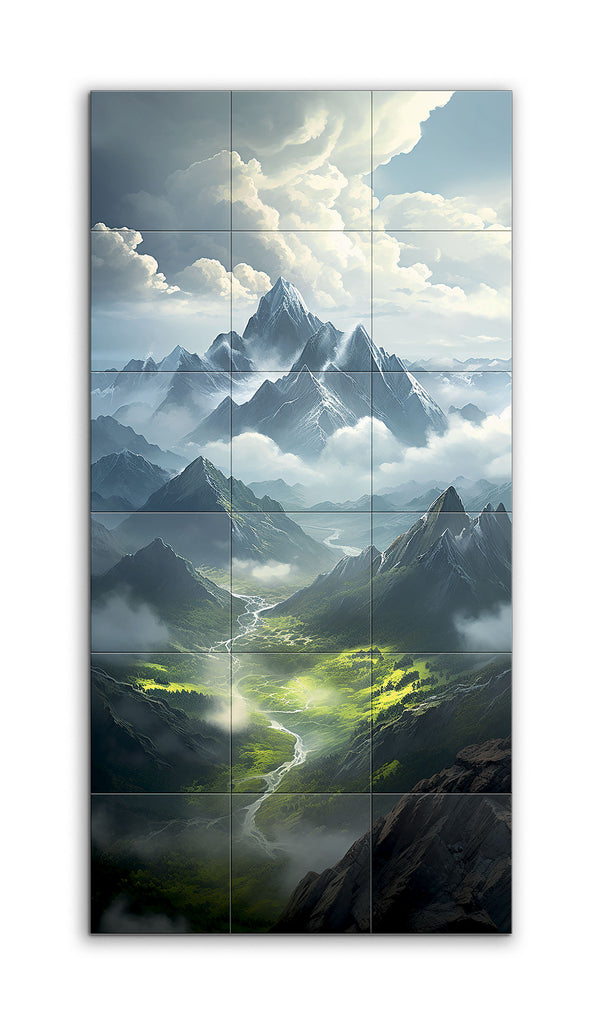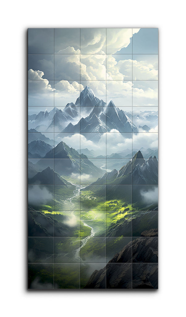 This tile mural showcases a breathtaking mountainous landscape with towering, jagged peaks and lush valleys. Snow-capped summits and misty mid-range mountains add depth and mystery. A verdant valley, bathed in sunlight, features a winding river that guides the eye through the scene. The cool blue and gray tones of the mountains contrast with the warm greens and yellows of the valley. Detailed and realistic, the artwork captures the natural beauty and grandeur of the landscape, creating a serene and awe-inspiring mood.