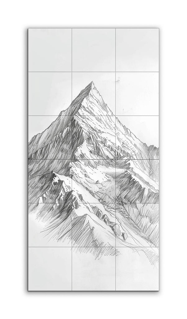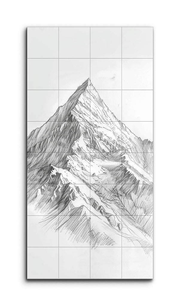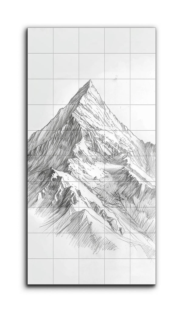 This tile mural features a meticulously detailed pencil sketch of a mountain, showcasing sharp, jagged peaks and steep slopes. The artist uses fine lines and shading to emphasize the rocky surfaces and the interplay of light and shadow, creating depth and texture. The monochromatic palette relies on varying pencil intensities to highlight the mountain's form and structure. The vertical composition, with the peak reaching towards the top, evokes a sense of height and grandeur, focusing attention on the mountain's majestic topography.