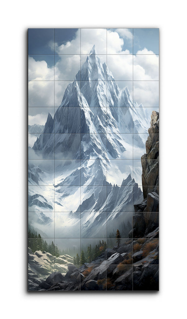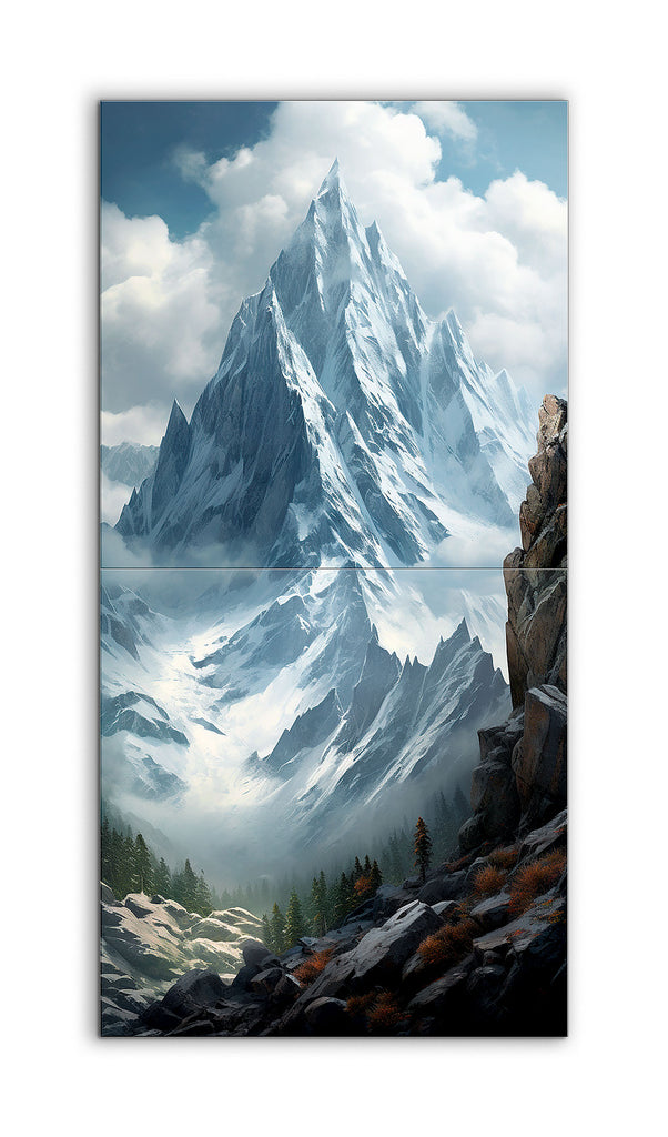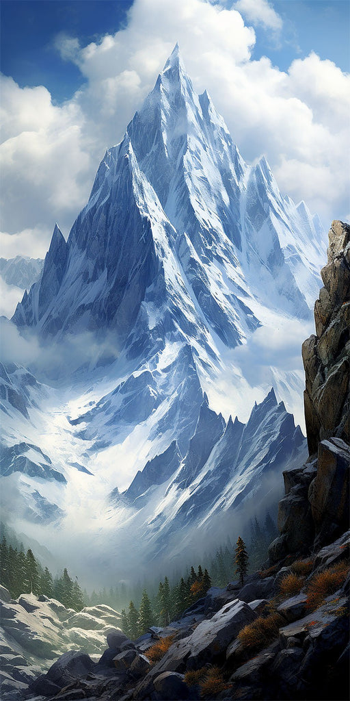 The artwork showcases a breathtaking mountain range, with towering, snow-capped peaks piercing a partly cloudy sky. The central peak stands out with its jagged edges and sheer cliffs, creating a dramatic focal point. Detailed snow captures the ice's texture and reflectiveness. The rocky foreground, in grey and brown tones, adds ruggedness, contrasted by patches of evergreen trees and shrubs. The realistic style, masterful light and shadow, and cool palette evoke a serene yet powerful remote mountain landscape.