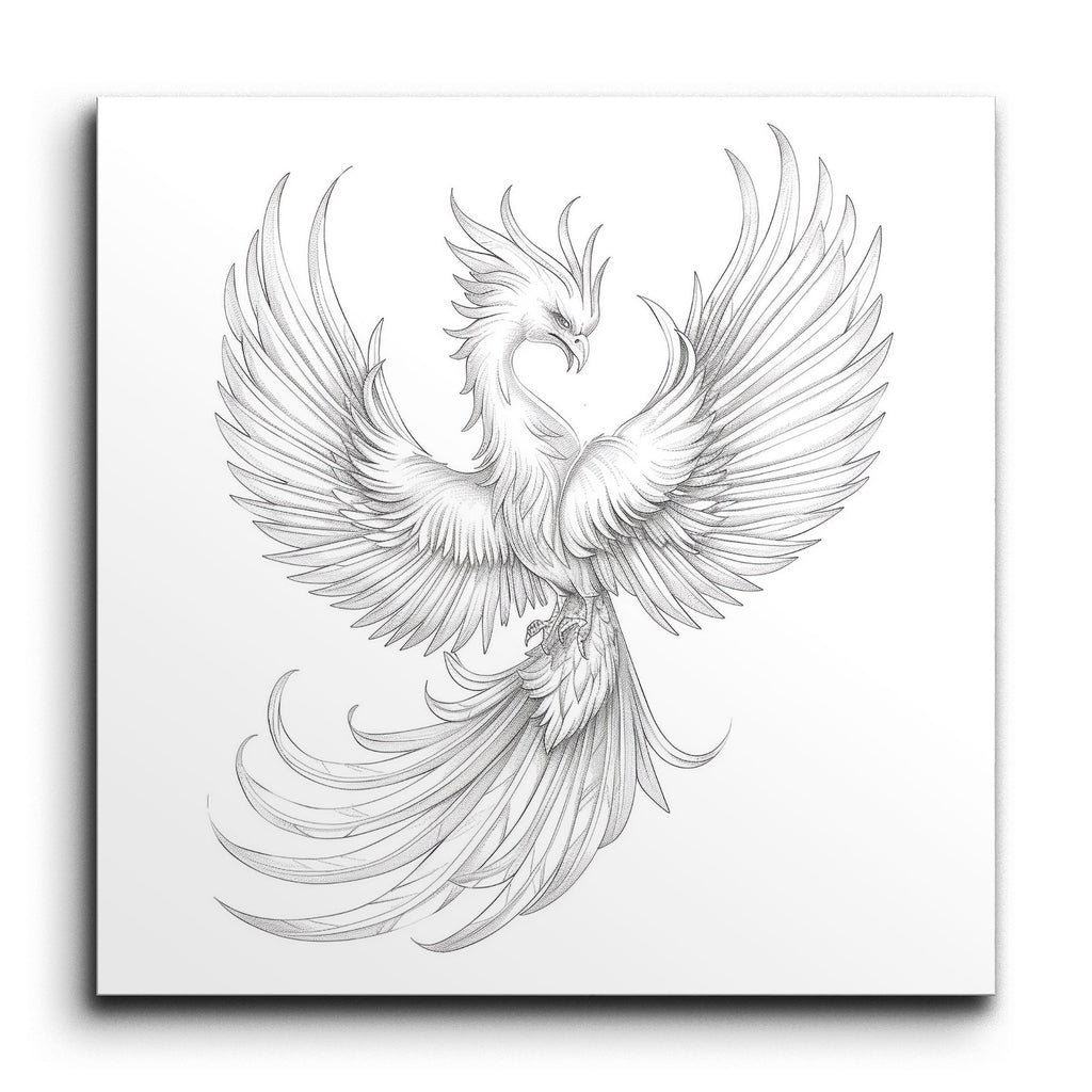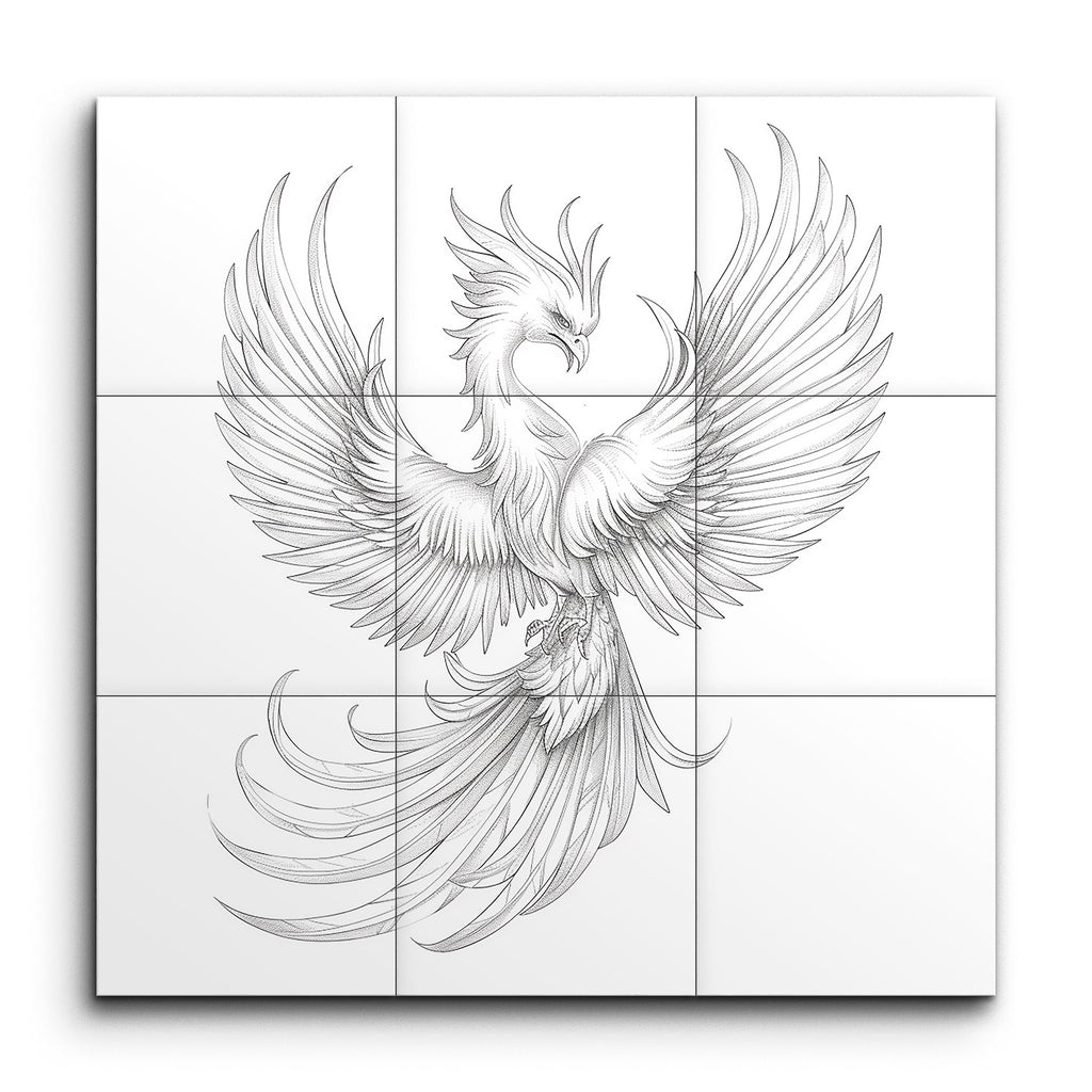 Transform your space with this breathtaking tile mural featuring a majestic phoenix. This artwork captures the essence of the mythical bird, symbolizing fire and rebirth, with its wings fully spread in a dynamic pose. The meticulously detailed feathers, flowing tail, and graceful arch of the neck bring an ethereal elegance to the piece. The monochromatic line work adds depth and sophistication, making the phoenix appear almost alive, as if soaring through the air. A stunning focal point for any room.